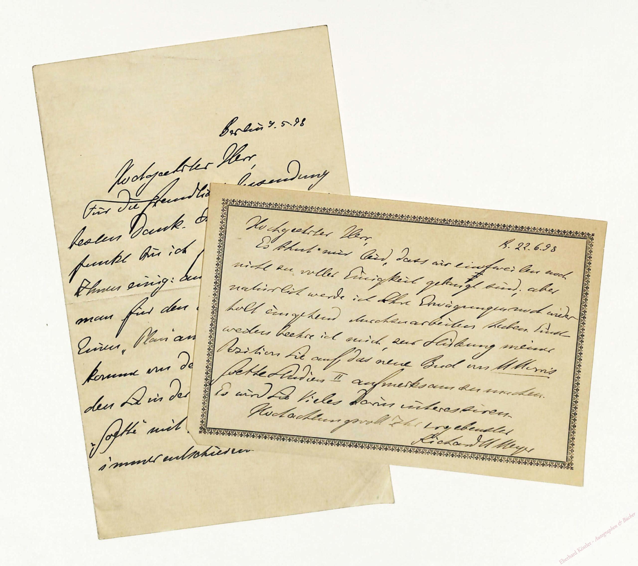 An Woldemar von Biedermann. – I. „[…] auch ich glaube, dass man für den älteren Faust nur Einen ‚Plan‘ anzunehmen hat und komme an dem ‚Diener des Erdgeistes‘ den Sie in derselben Auflage meines ‚Goethe‘ mit Recht beanstandeten, immer entschiedener zurück. Dass der ‚erhabene Geist‘ Gott selber sei und dass dabei (neben Herders ‚Gott‘ möchte ich jedenfalls hinanfügen) das Buch Hiob mit wirkte, hat Ihre Darlegung nur höchst wahrscheinlich gemacht; ganz wage ich mich hier noch nicht zu ergeben, denn die Aussage, dass Gott selbst Faust an Mephisto geschmiedet habe, scheint Faust doch fast zu sehr zum Mitwisser des Prologs im Himmel zu machen. Gar nicht kann ich aber mit Ihnen […] Mannings Auffassung des Paralip. 1 annehmen. Sie sagen S. 10 Goethe schrieb Schiller, dass der erste Plan des ‚Faust‘ eigentlich nur eine Idee gewesen sei […] In diesem Brief steht doch aber nur ‚der Plan‘; dass der erste gemeint sei, ist nirgends angedacht, vielmehr scheint der ganze Zusammenhang an der herkömmlichen Auffassung unrichtig, dass ein neuer, etwa aus 1790 stammender Gesamtplan gemeint ist. Und ferner: Dass Goethe auch nur einen Augenblick lang ein Faustdrama ohne Mephistopheles geplant haben soll, scheint mir undenkbar, und die Folgerung, die Sie aus dessen Nichterwähnung ziehen, allzu kühn […]“ – II. „[…] Einstweilen beehrte ich mich, zur Stärkung meiner Position Sie auf das neue Buch von M[ax] Morris Goethe Studien II aufmerksam zu machen […]“