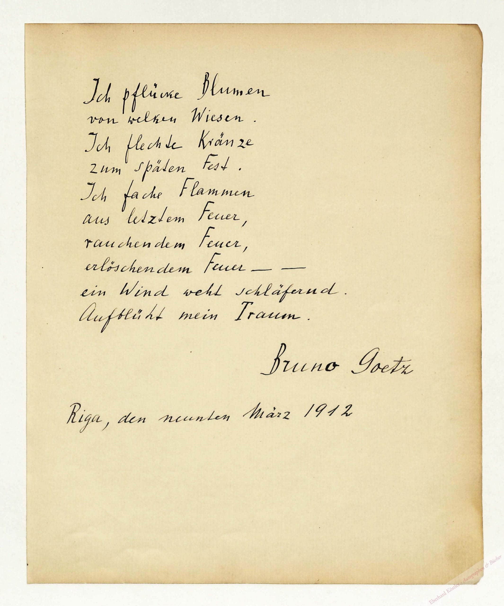 „Ich pflücke Blumen | von welken Wiesen | Ich flechte Kränze | zum späten Fest […]“ – Bruno Goetz stammte aus Riga und studierte 1904 bis 1910 in München und Wien, um danach einige Jahre als Theaterkritiker und Feuilletonist für Rigaer Zeitungen zu schreiben. Er litt schon von Jugend an unter Schwermut. Wegen seiner Melancholie konsultierte er Sigmund Freud, um von ihm die Empfehlung zu erhalten, keine Psychoanalyse durchzuführen. Von Wien aus ging Goetz nach Ascona zur Künstlerkolonie Monte Verità, wo er bis 1909 blieb und dem Kreis um Johannes Nohl, Erich Mühsam und Lotte Hattemer angehörte. Er flüchtete mit Carlo Holzer aus Ascona und war dann bis in die 1920er Jahre ein umherschweifender Bohèmien, mit Aufenthalten in Zürich und Berlin, wo er als Korrespondent für verschiedene Zeitungen tätig war. Während seiner Wanderjahre schloss er Bekanntschaften mit Friedrich Glauser und Gusto Gräser. – Vgl. Leben im Ostwind, S. 309.