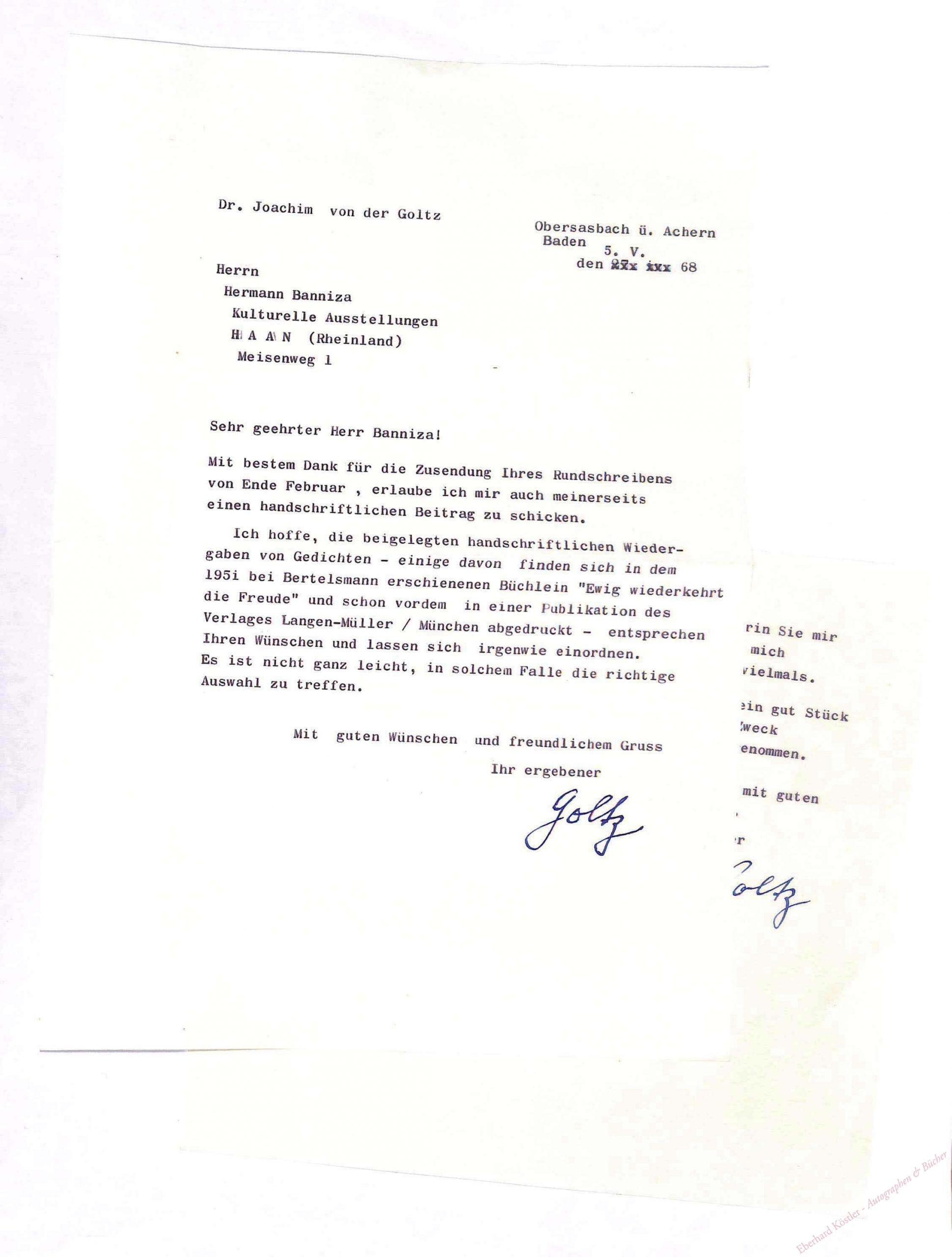 An Hermann Banniza bei Gelegenheit der Übersendung von Gedichtmanuskripten. – Einer der Briefe am Oberrand beschnitten (Verlust der Adresse).