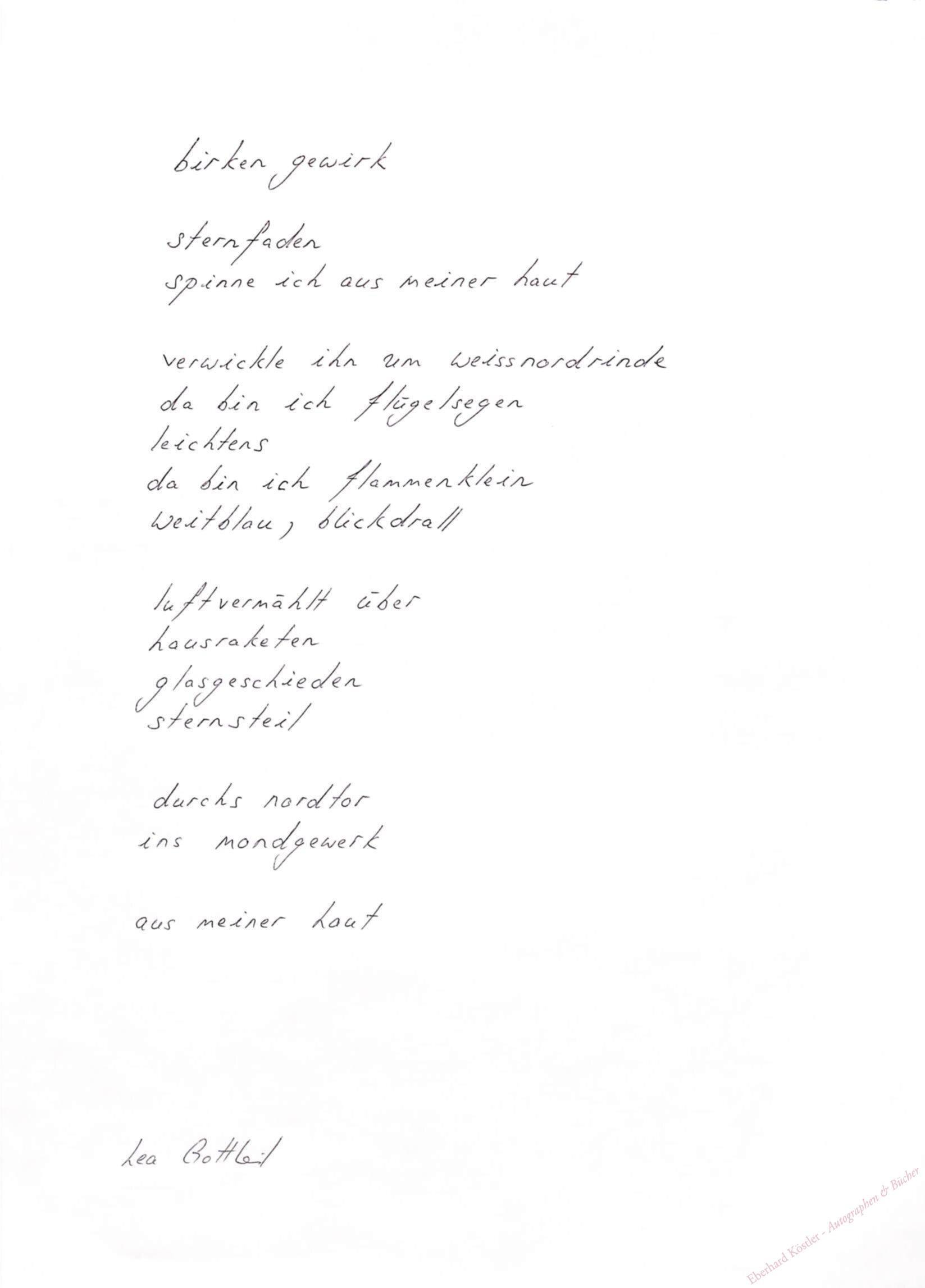 Gottheil antwortet einen Autographensammler und schickt ihm folgendes Gedicht: „birken gewirk || sternfaden | spinne ich aus meiner haut | verwickle ihn um weissnordrinde | da bin ich flügelsegen | leichtens | da bin ich flammenklein | weitblau, blickdrall | luftvermählt über | hausraketen | glasgeschieden | sternsteil | durchs nordtor | ins mondgewerk | aus meiner haut.“