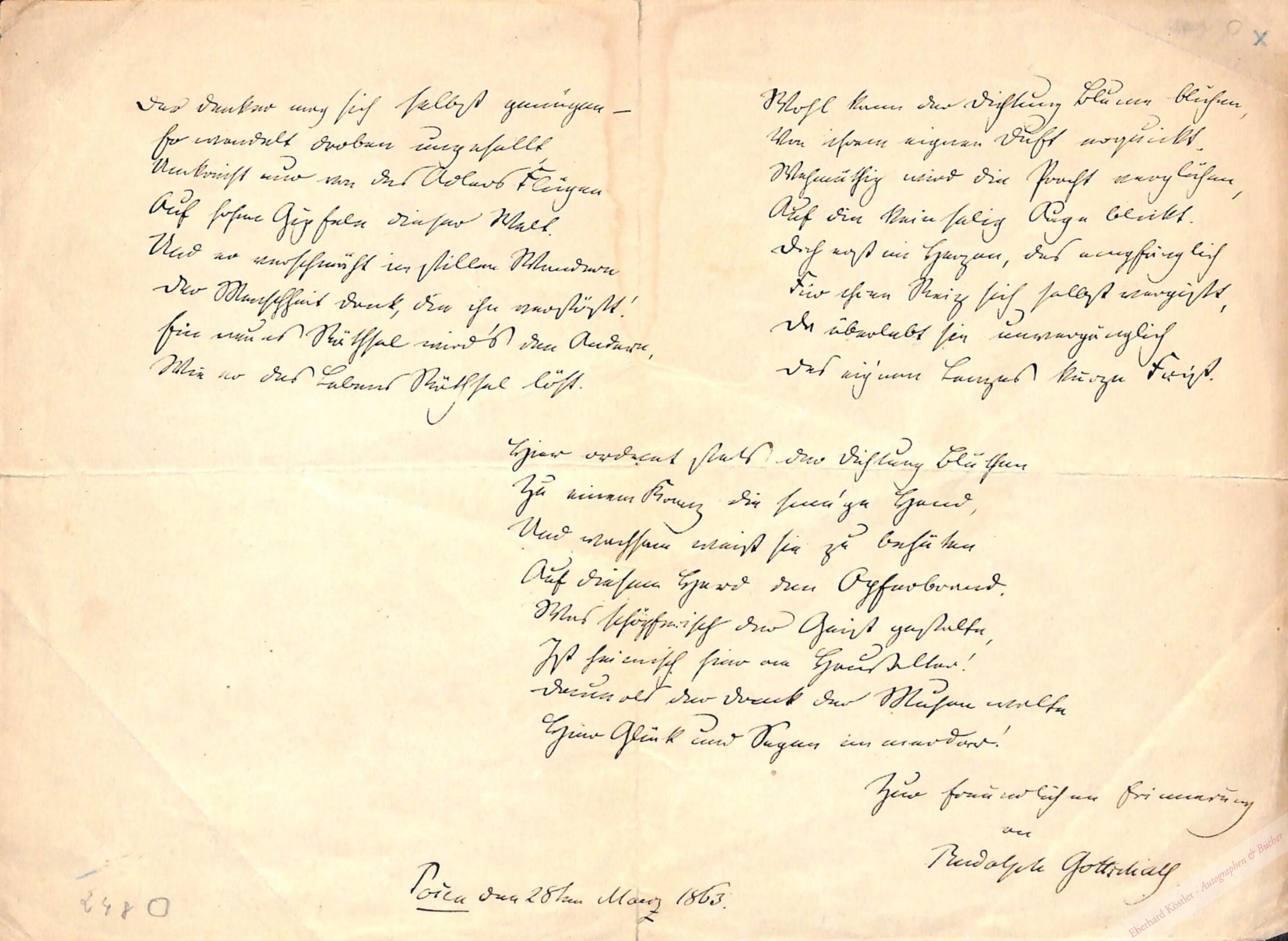 „Der Denker mag sich selbst genügen – | Er wandelt droben ungesellt […]“ – Einriss hinterlegt. – Beiliegt: I. Ders. Eigenh. Postkarte mit U. Leipzig 1899. An Max Grube. – II. Eigenh. Billett mit U.