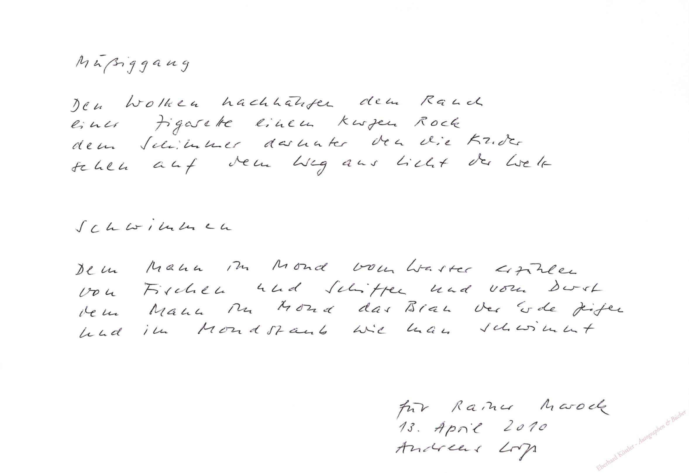 Grosz schickt einem Autographensammler zwei Gedichte: „Müßiggang || Den Wolken nachhängen dem Rauch | einer Zigarette einem kurzen Rock | dem Schimmer darunter den die Kinder | sehe nauf dem Weg ans Licht der Welt || Schwimmen || Dem Mann im Mond vom Wasser erzählen | von Fischen und Schiffen und vom Durst | dem Mann im Mond das Blau der Erde zeigen | und im Mondstaub iwe man schwimmt“