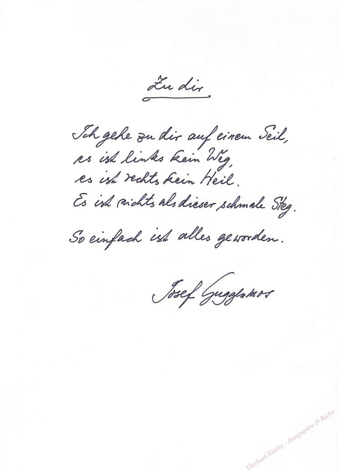 Guggenmos kommt mit der Übersendung des Gedichtes der Bitte eines Autographensammlers nach und gratuliert diesem zu seiner „erstaunlichen Sammlung“. Gedicht: „Zu dir || Ich gehe zu dir auf einem Seil, | es ist links kein Weg, | es ist rechts kein Heil. | Es ist nichts als dieser schmale Steg. | So einfach ist alles geworden.“