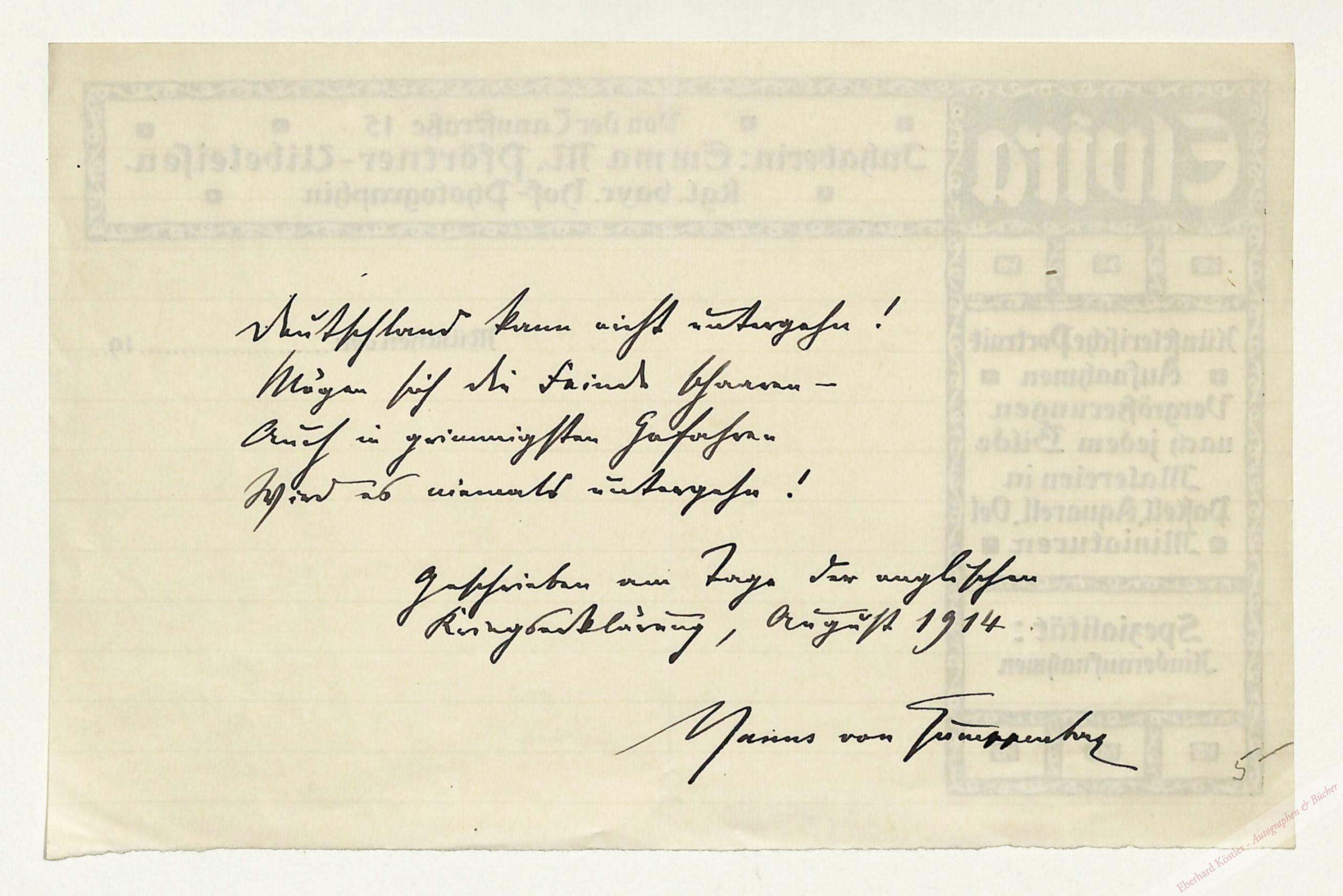 „Deutschland kann nicht untergehn! […] Geschrieben am Tage der englischen Kriegserklärung[…]“ – Hier irrte Gumppenberg. – Auf der Rückseite eines Briefbogens des Ateliers „Elvira“.