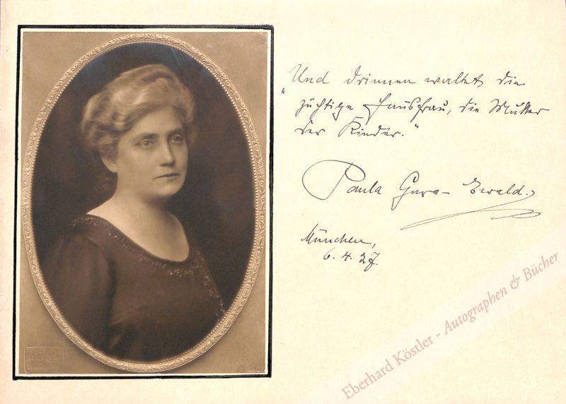 „Und drinnen waltet die züchtige Hausfrau, die Mutter der Kinder. Paula Gura-Ewald | München, 6. 4. 27“. – Daneben die schöne Porträtfotografie aus dem Atelier Lützel, München 1926. – Paula Gura-Ewald schrieb populäre Ratgeber „Die Frau von heute“ (1915) oder „Das junge Mädchen im Hause, auf der Straße und in Gesellschaft“ (1921).