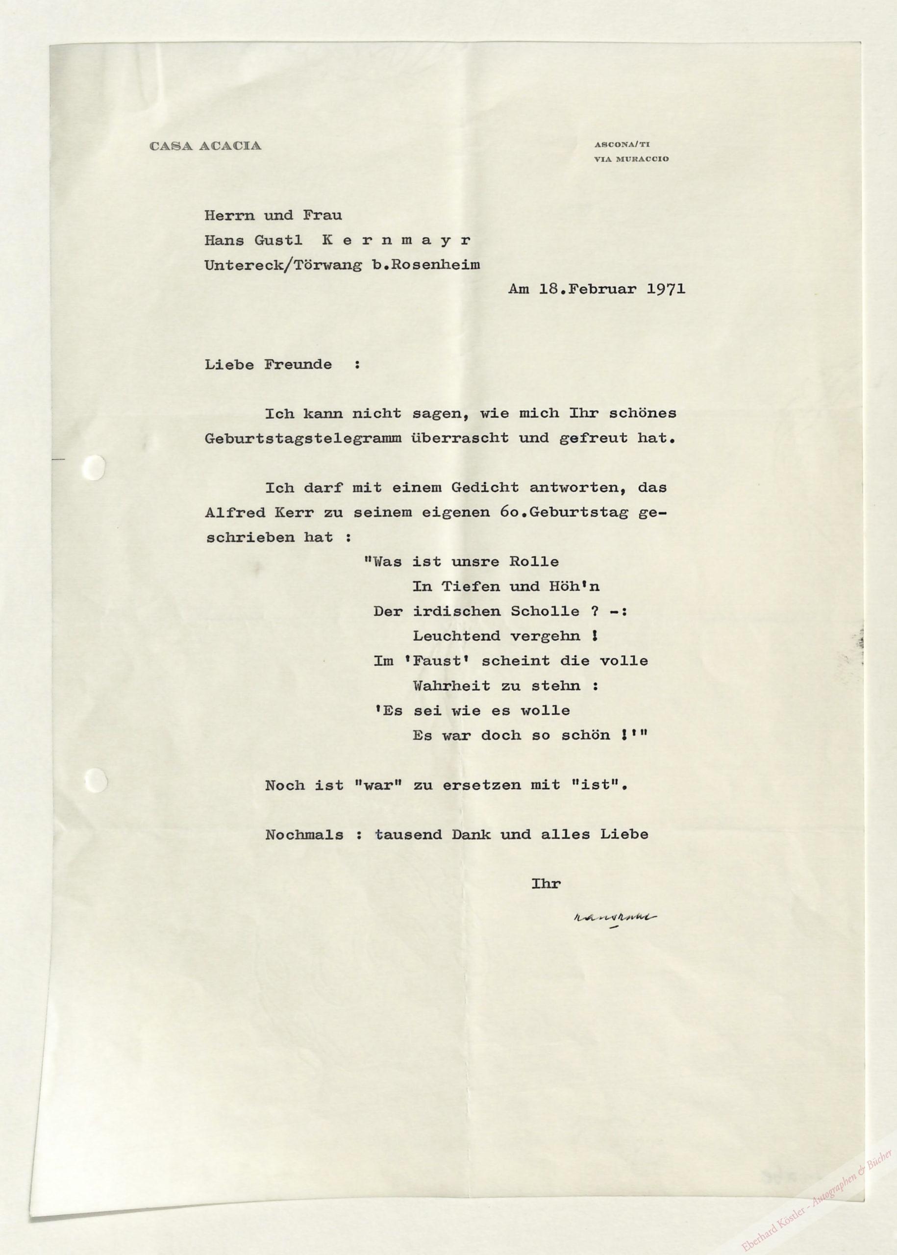 Dankt mit einem Gedicht von Kerr für Glückwünsche zu seinem 60. Geburtstag.