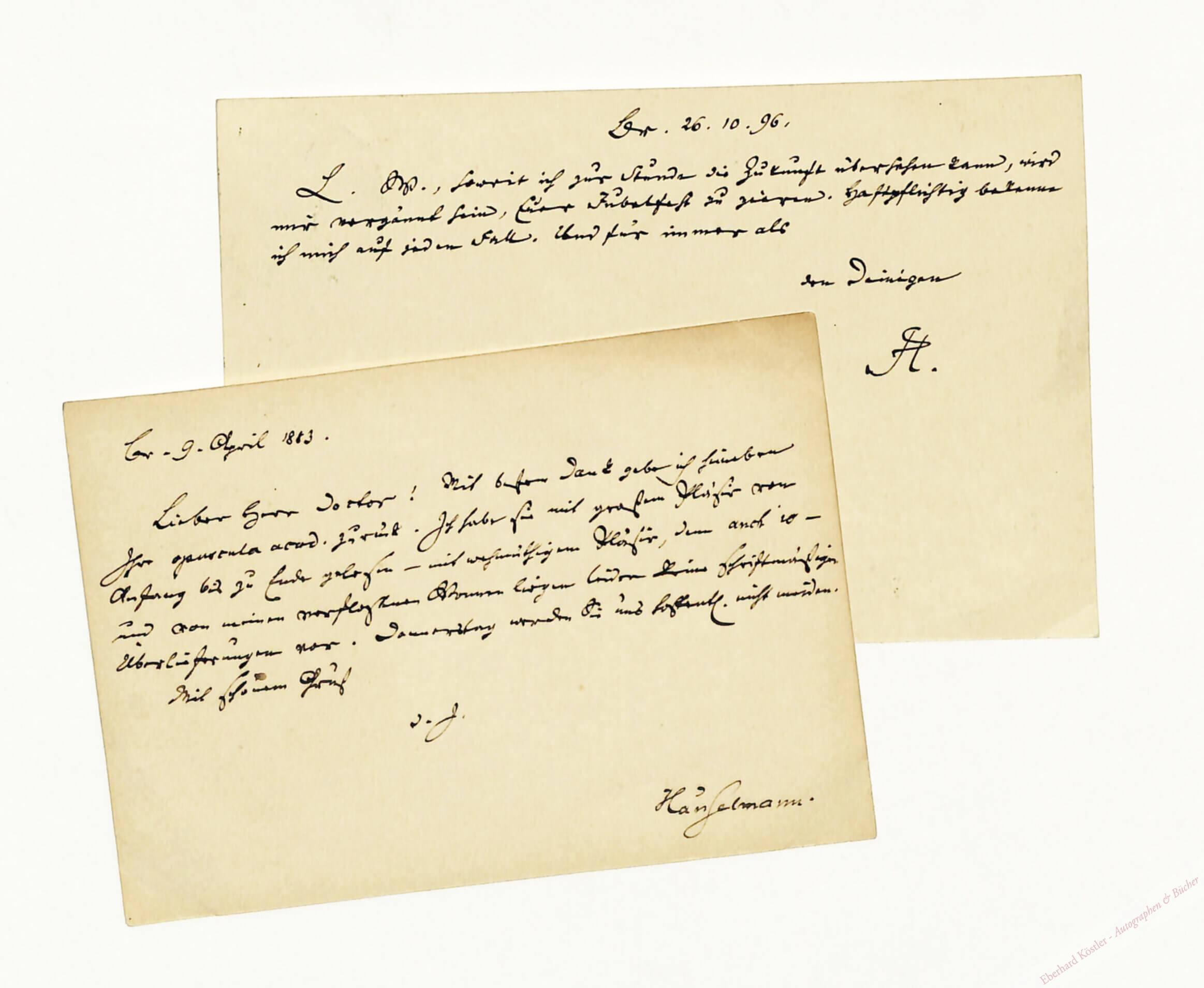 An den Schriftsteller und Lehrer Wilhelm Brandes in Wolfenbüttel (1854-1928). – I. „[…] Mit bestem Dank gebe ich hierbei Ihre opuscula acad. zurück. Ich habe sie mit großen Pläsier von Anfang bis zu Ende gelesen – mit wehmütigem Pläsier, denn anch’io – und von meinen verflogenen Wonnen liegen keine schriftmäßigen Überlieferungen vor […]“ – II. „[…] soweit ich zur Stunde die Zukunft übersehen kann, wird mir vergönnt sein, Euer Jubelfest zu zieren. Haftpflichtig bekenne ich mich auf jeden Fall […]“ – Seit 1862 Stadtarchivar, übernahm Hänselmann zusätzlich die Leitung der Stadtbibliothek, 1898 die des Stadtmuseums in Braunschweig. 1886 wurde ihm der Professorentitel verliehen.