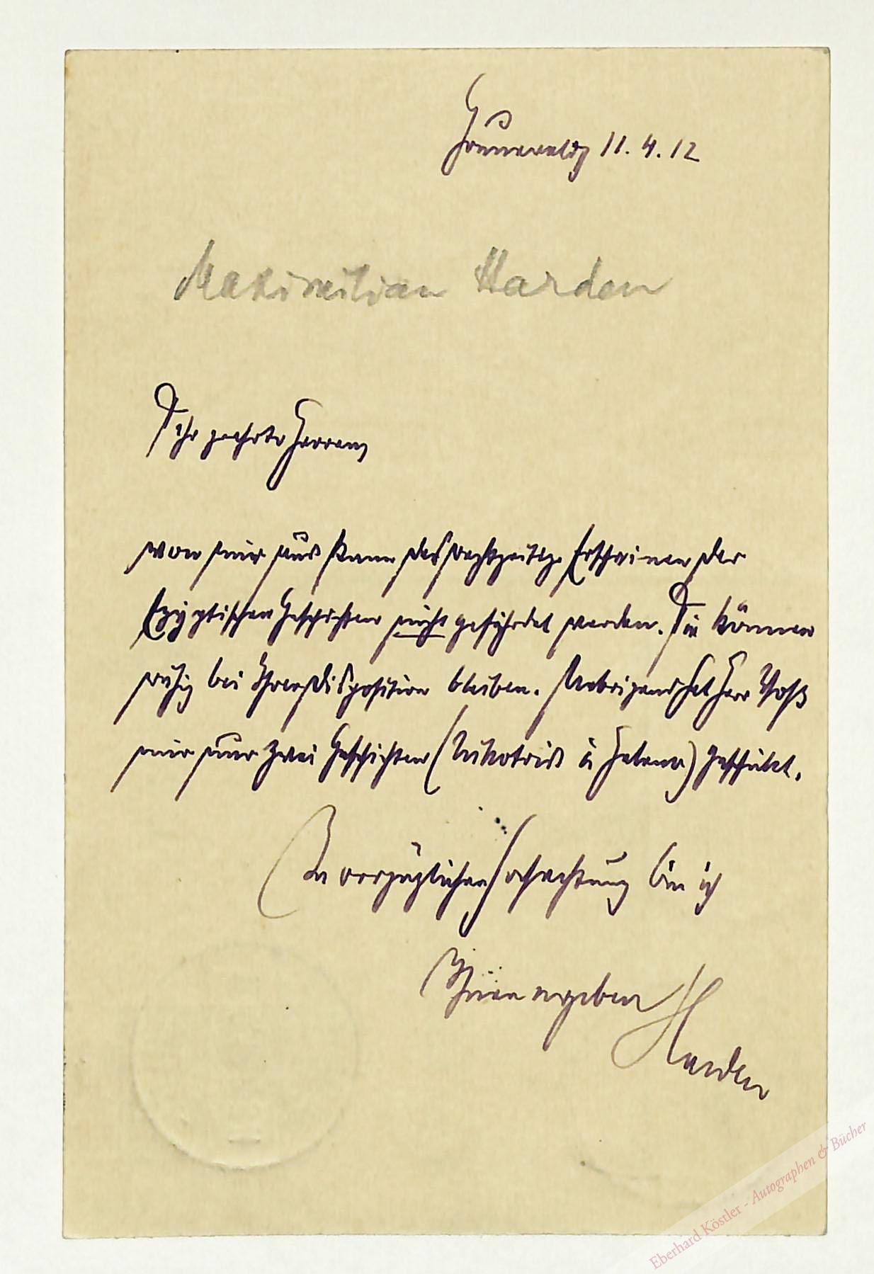 An den Engelhorn-Verlag in Stuttgart, dem er mitteilt, das das Erscheinen der „Egyptischen Geschichten“ von Richard Voss nicht gefährdet sei.