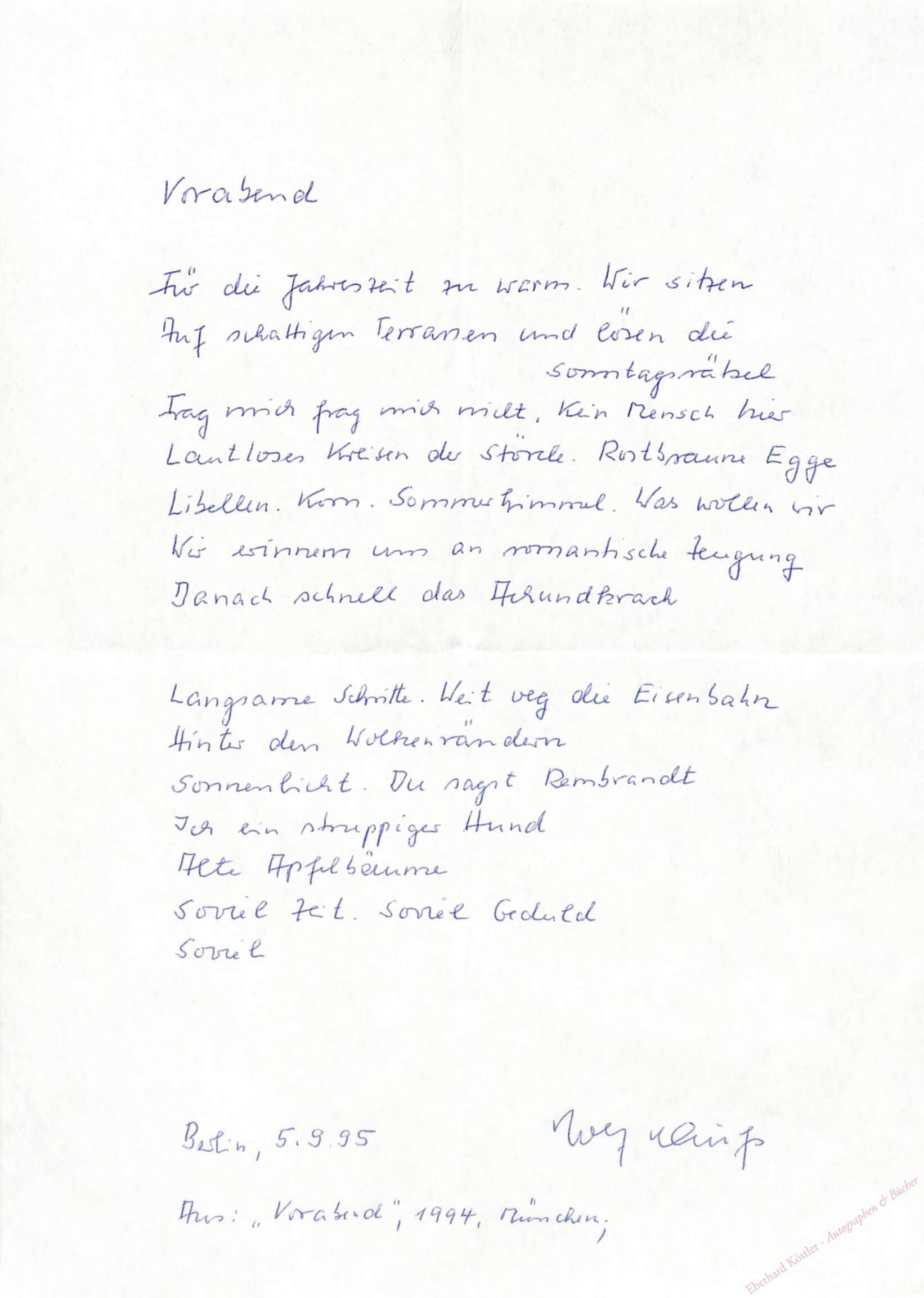 „Vorabend || Für die Jahreszeit zu warm. Wir sitzen | Auf schattigen Terrassen und lösen die Sonntagsrätsel | Frag mich frag mich nicht. Kein Mensch hier | Lausloses Kreisen der Störche. Rostbraune Egge | Libellen. Korn. Sommerhimmel. Was wollen wir | Wir erinnern uns an romantische Zeugung | Danach schnell das Achundkrach…“