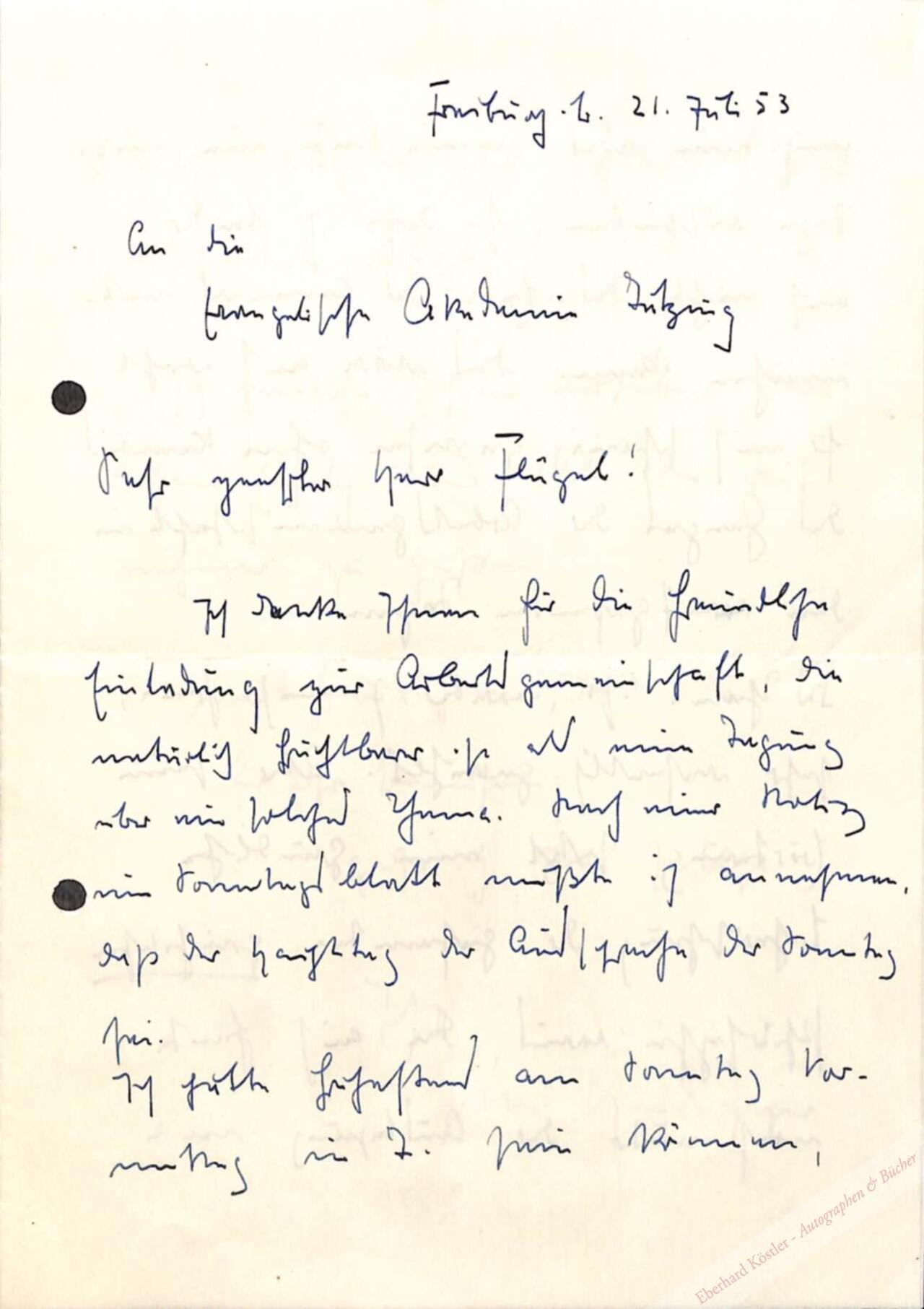 „An die Evangelische Akademie Tutzing. Sehr geehrter Herr Flügel! Ich danke Ihnen für die freundliche Einladung zur Arbeitsgemeinschaft, die natürlich fruchtbarer ist als eine Tagung über ein solches Thema. Nach einer Notiz im Sonntagsblatt mußte ich annehmen, daß der Haupttag der Aussprache der Sonntag sei. Ich hätte frühestens am Sonntag Vormittag in T[utzing] sein können, muß nun aber meine Reise um einige Tage verschieben, so daß ich leider auch nicht das Ende des Seminars mitmachen kann. Dies wäre auch wohl für mich schwierig gewesen ohne Kenntnis des Ganges der Arbeitsgemeinschaft in den vorausgehenden Tagen. Das Thema ist, worüber ich mich sehr freue, sehr wesentlich gewählt. Aber seine Erörterung setzt eine gründliche Beherrschung der gesamten griechischen Philosophie voraus, die auch heute noch unter der Auslegung mit Hilfe abgeleiteter später Begriffe verschüttet liegt. Ich wünsche Ihrem Vorhaben den besten Erfolg […]“
