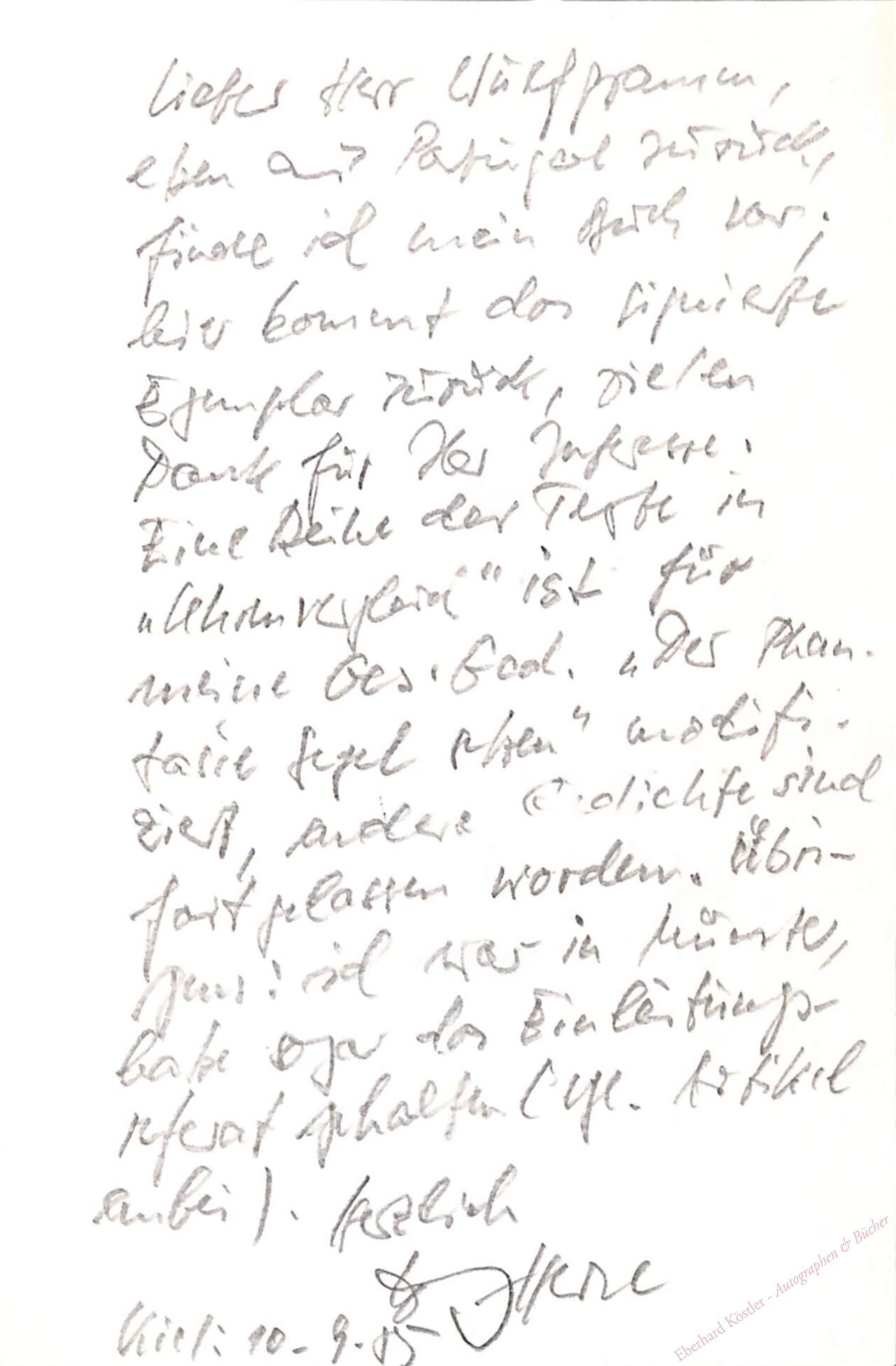Sendet ein signiertes Exemplar von „Uhrenvergleich“ und erwähnt seine Gedichtsammlung „Der Phantasie die Segel setzen“. – Beiliegend 3 signierte Sonderdrucke und Fotokopien.