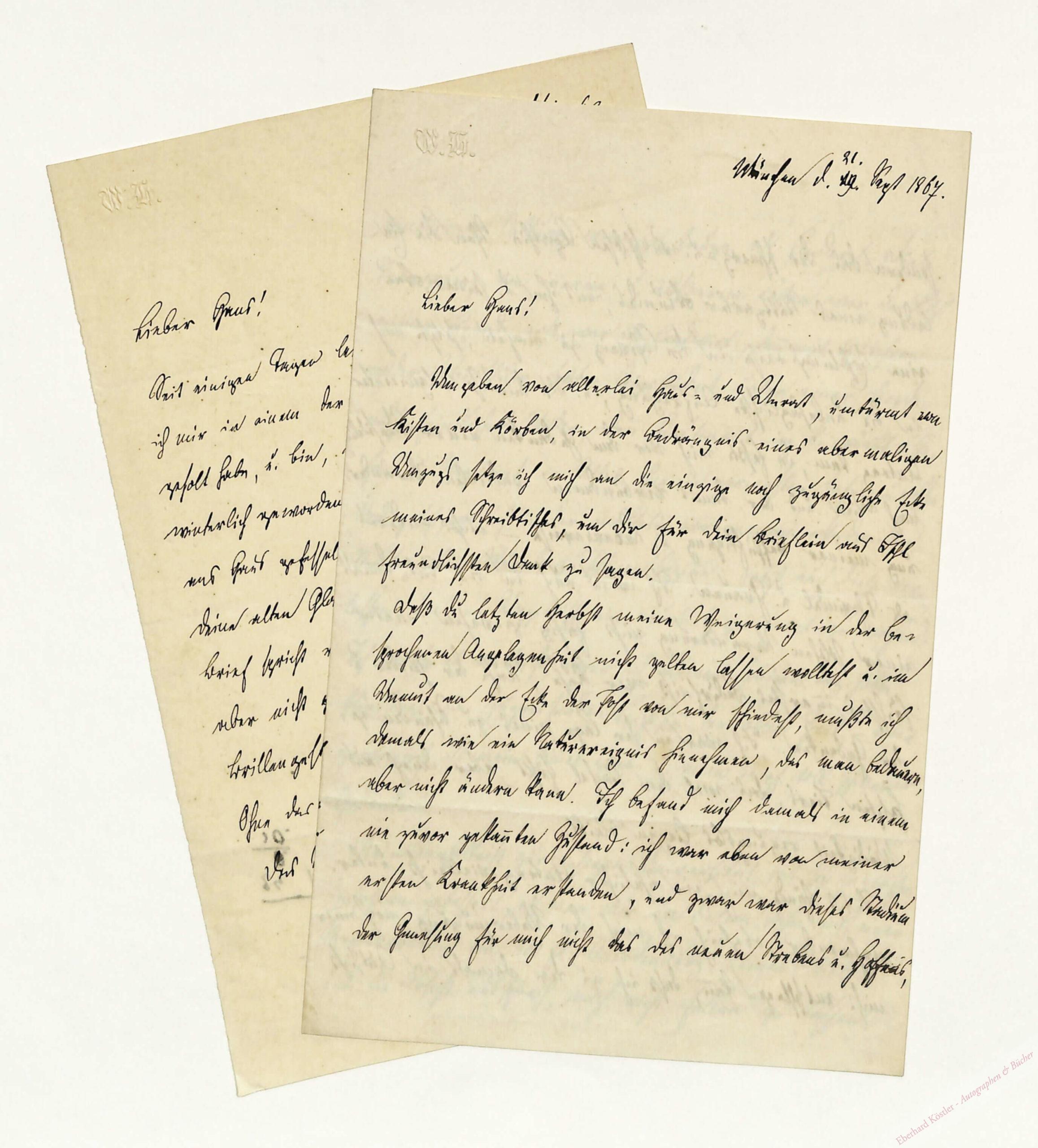 2 eigenhändige Briefe mit Unterschrift München, 21. IX. 1867 und 26. III. 1869, Gr.-8°. Zus. 5 Seiten. Briefköpfe mit geprägtem Monogramm.