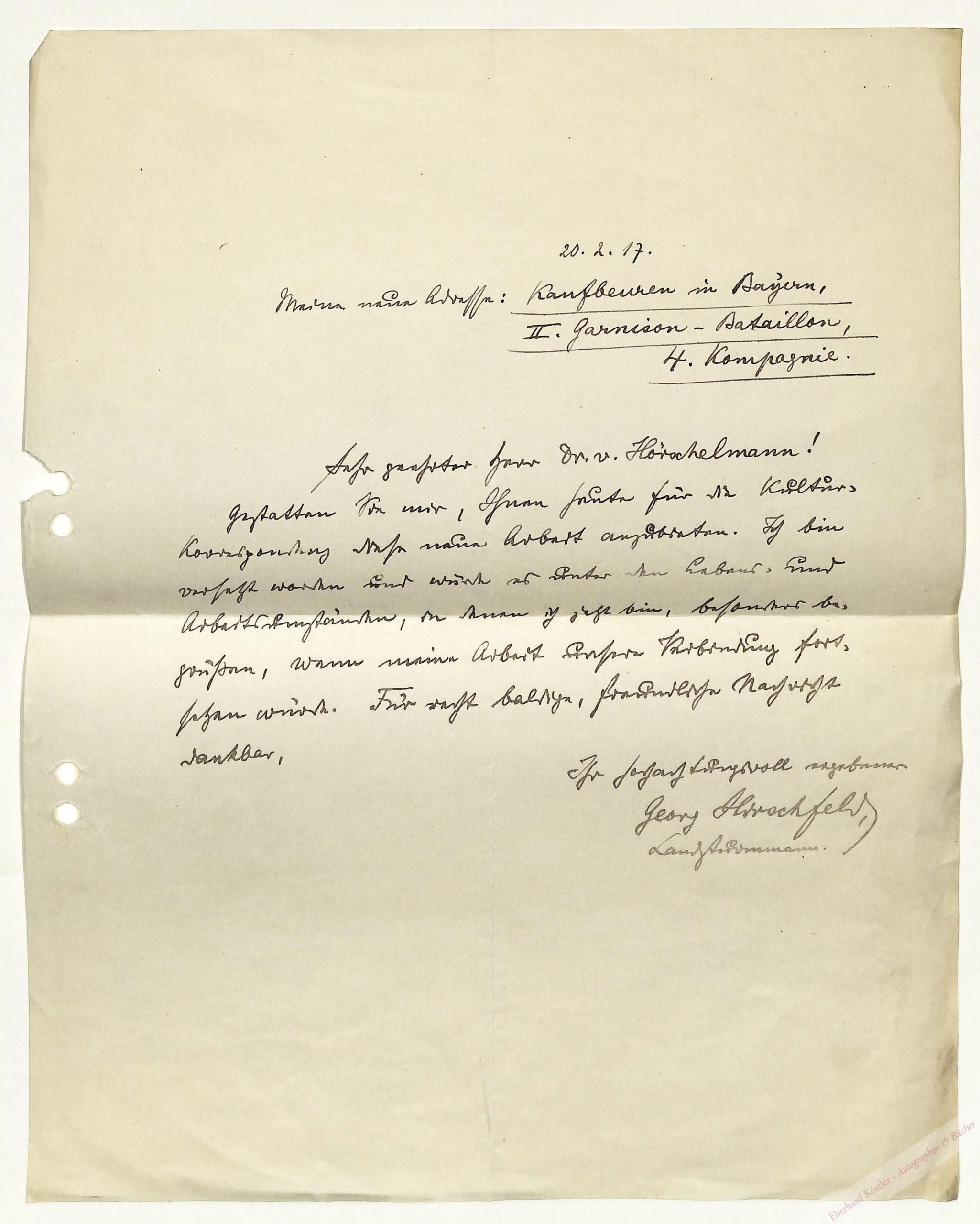 An Harald von Hoerschelmann bei Übersendung eines Beitrags für dessen Kultur-Korrespondenz. – Georg Hirschfeld war 1917 Landsturmmann. Seine Schriften wurden vom Nationalsozialismus in Deutschland verboten.