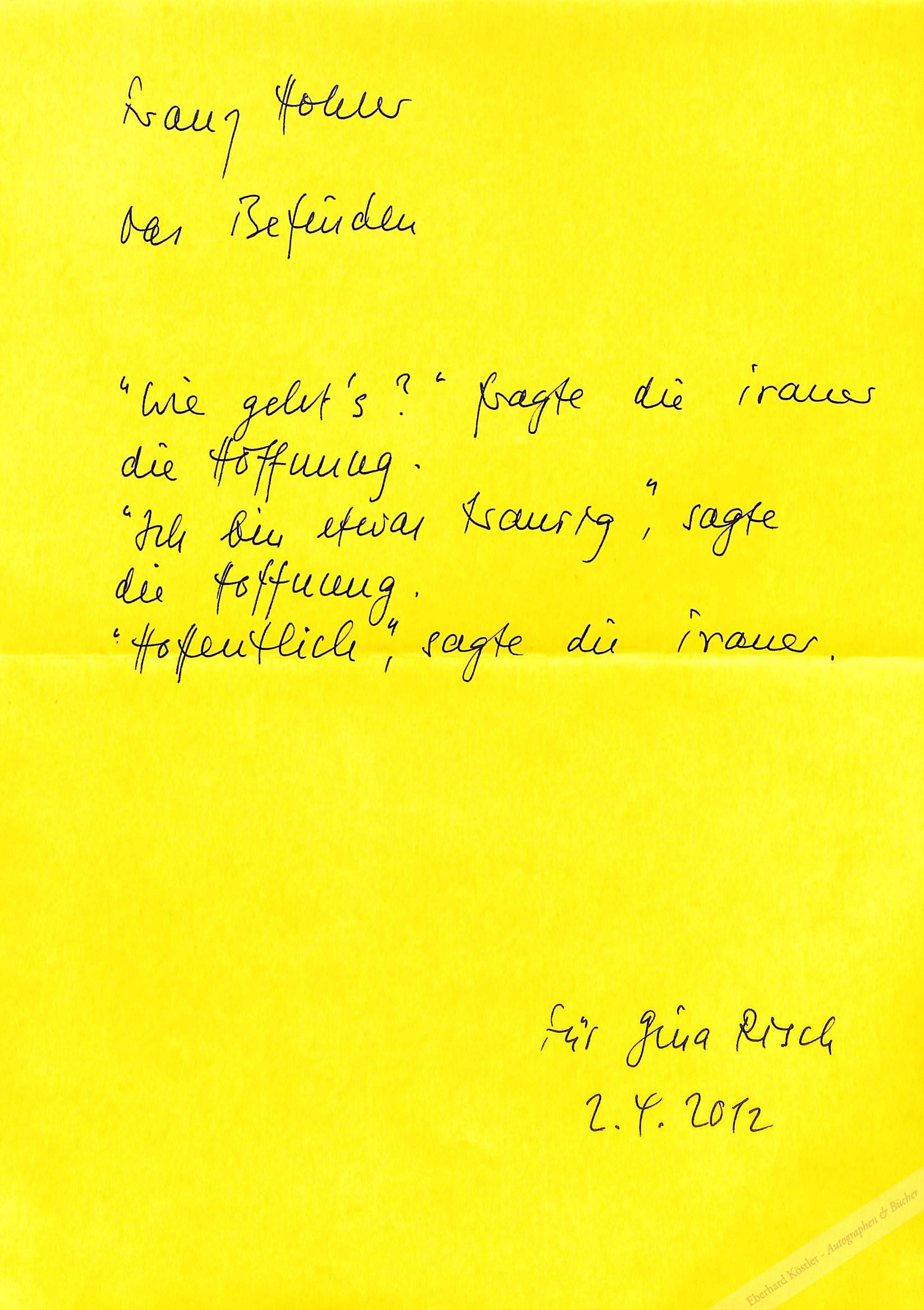 „Franz Hohler || Das Befinden || ‚Wie geht’s?‘ fragte die Trauer | die Hoffnung. | ‚Ich bin etwas traurig‘, sagte | die Hoffnung. | ‚Hoffentlich‘, sagte die Trauer.“