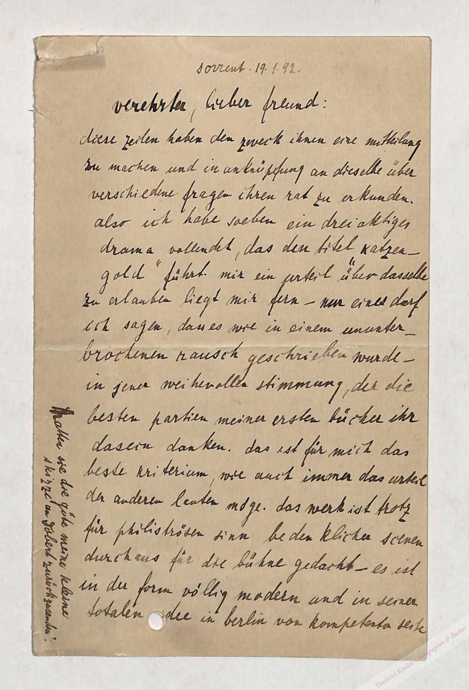 In konsequenter Kleinschreibung an einen Freund mit der Bitte um ein Urteil über seinem dreiaktiges Drama „Katzengold“, das er gerne in Berlin auf der Bühne sehen würde. „[…] „wenn die arbeit mir eine freie stunde ließ, dann sass ich auf ragenden steine und blickte mit verträumtem auge in die weite adria, deren schillerndes wogenspiel einen so seltsam weich und traurig stimmt. aber ich fürchte der ragende stein wird mir gefährlich und gefährlich auch die träume […] darum verlasse ich schon übermorgen sorrent, um mich nach capri zu wenden […]“ – Hollaender studierte an der Universität Berlin. Bereits während der ersten Semester konnte er seinen ersten Roman veröffentlichen. Da auch seine weiteren Publikationen sehr erfolgreich waren, brach Hollaender sein Studium ab und ging auf Reisen. Allerdings führte ihn seine finanzielle Situation bereits zwei Jahre später wieder nach Berlin zurück. „Als Dramatiker debütierte Hollaender 1890 mit Szenen aus einem Schauspiel ‚Katzengold‘ im ‚Zuschauer‘.“ (NDB)