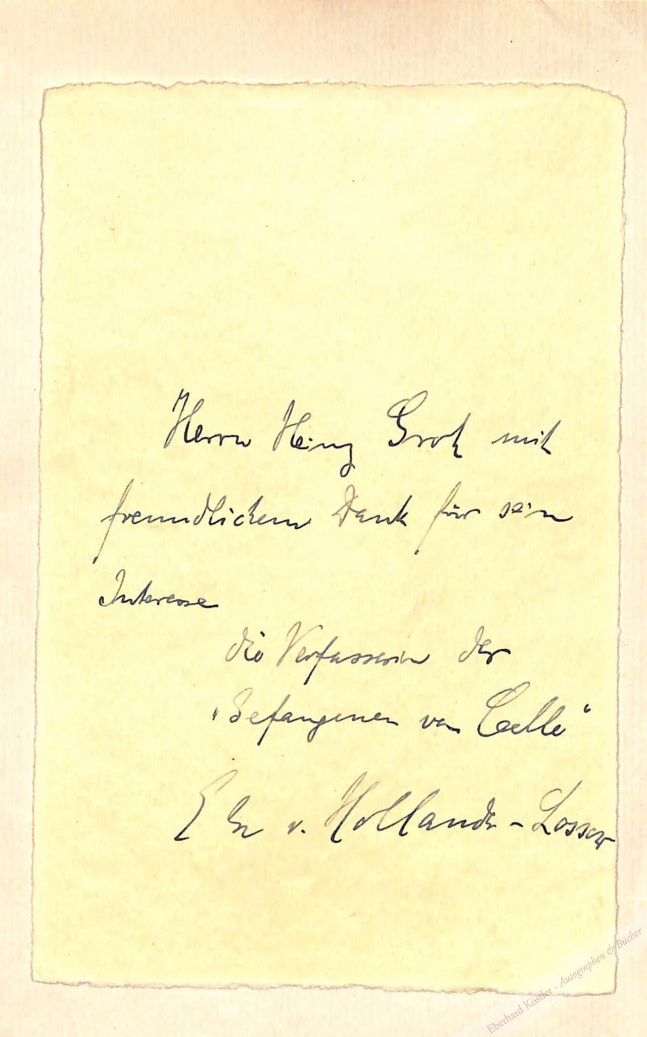 „Herrn Heinz Groh mit freundlichem Dank für sein Interesse | die Verfasserin der ‚Gefangenen von Celle‘ Else v. Hollander-Lossow.“
