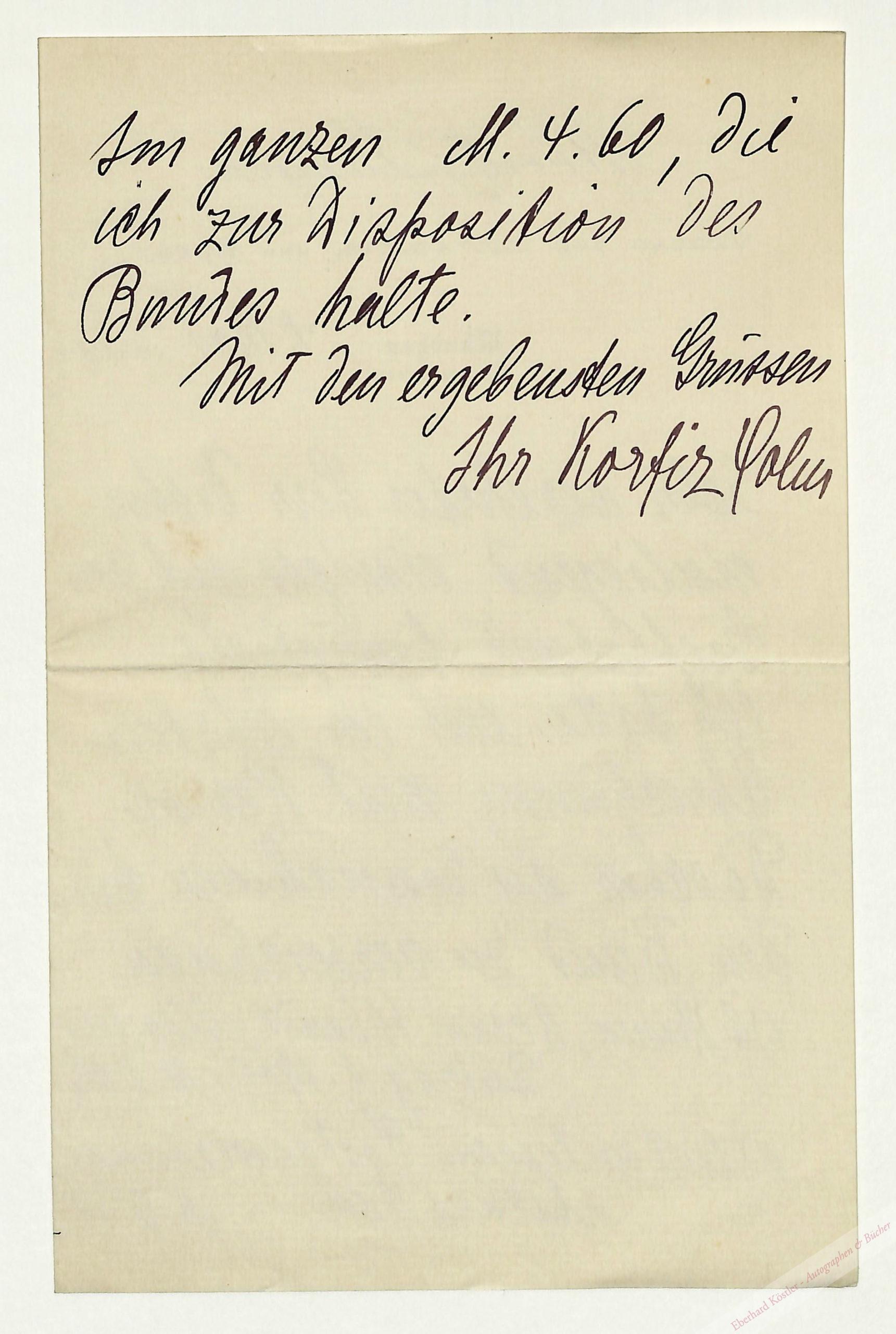 „Sehr verehrter Herr Doctor, einliegend einiges auf den Goethebund bezügliche. Ich hatte seit der letzten Abrechnung mit Herrn Döscher an Einnahmen für den Bund zu verzeichnen: […] Im ganzen M. 4.60, die ich zur Disposition des Bundes halte […]“ – Korfiz Holm war beim Verlag Langen in leitender Stellung tätig.