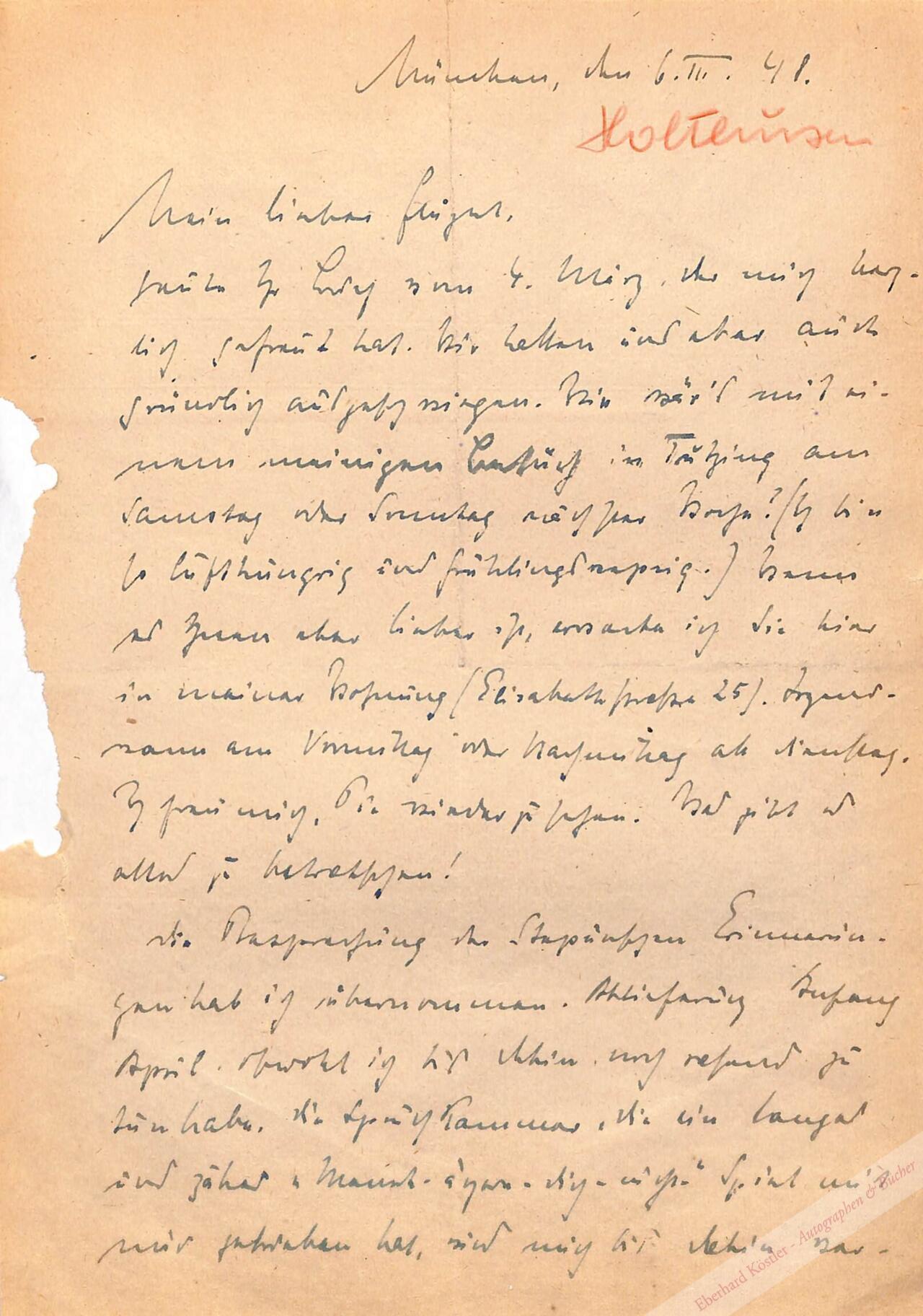 An Heinz Flügel in Tutzing wegen eines Treffens: „[…] Die Spruchkammer, die ein langes und zähes ‚Mensch-ärgere-dich-nicht-‚Spiel mit mir getrieben hat, wird mich bis dahin vermutlich freigesprochen haben […] Ich hasse Tagungen und alles berufsmässige Diskutieren […] Ich finde das ‚Glasperlenspiel‘ von dem ich nur ein paar Seiten gelesen habe, ziemlich langweilig und rechne es nicht zu den wesentlichen Büchern der Epoche […]“ – Die Münchner Spruchkammer stufte Holthusen 1948 als betroffen, aber entlastet ein. – Papierbedingt gebräunt, Buchstabenverlust durch Randausriss.