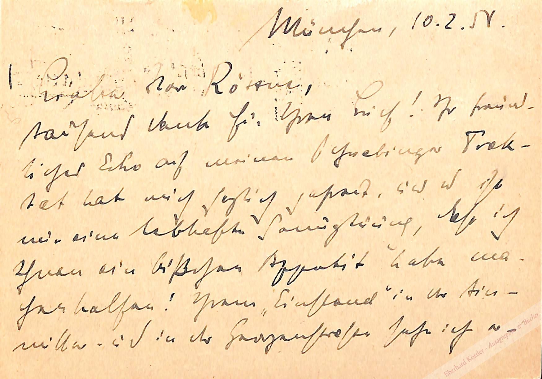 An den Lektor Hans Rössner in Wiesbaden mit Dank für ein „freundliches Echo auf meinen Schwabinger Traktat“. – Holthusens „Kleines Kolleg über Schwabing“ erschien in „Atlantis“, 30 (1958), Heft 3.