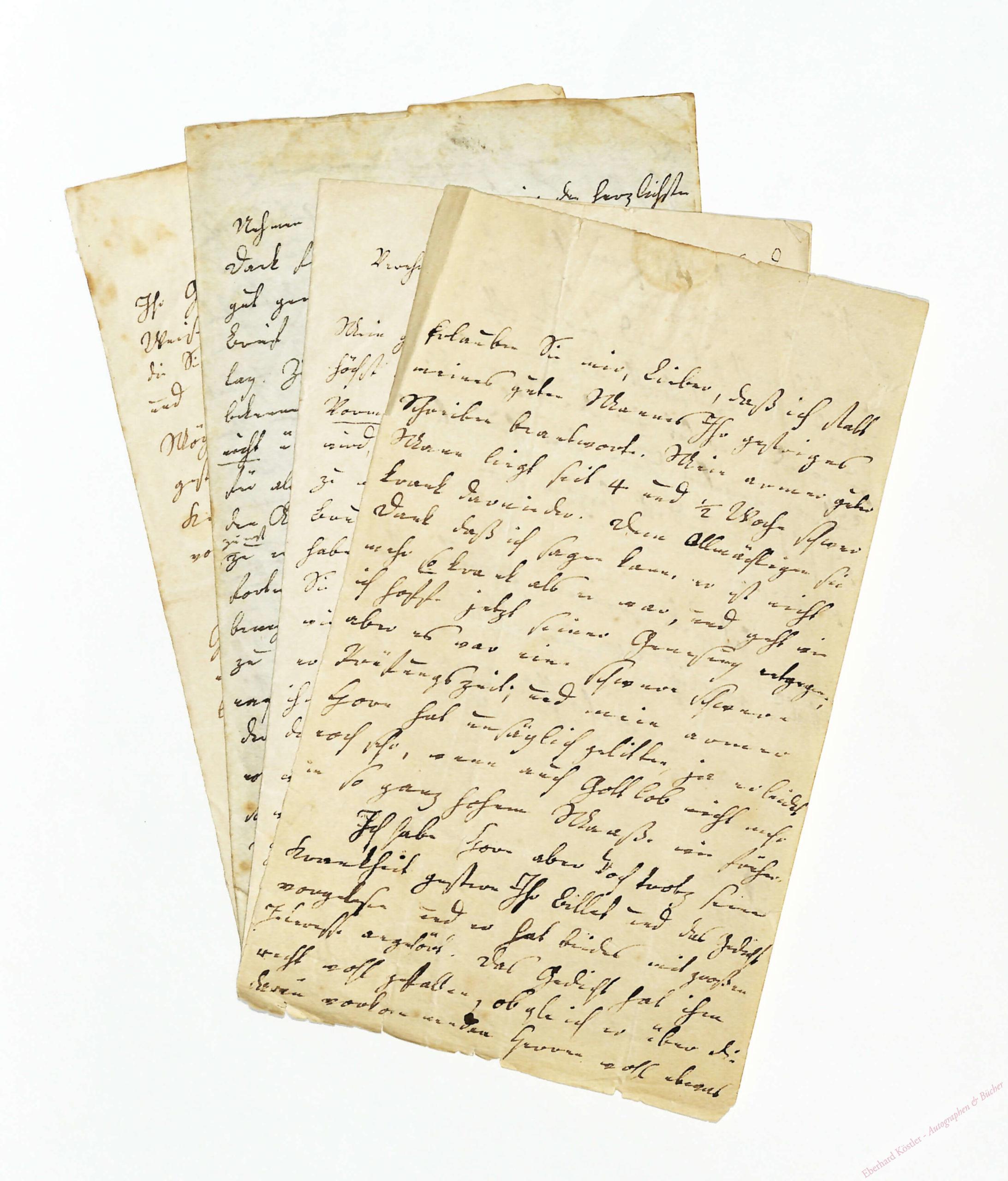 An den Buchhändler Wilhelm Langewiesche im Namen ihres kranken Mannes über Gedichte Langewiesches sowie mit einer Einladung. – „Horn [1781-1837] war einer der führenden Literaturproduzenten des frühen 19. Jahrhunderts. Mit den meisten zeitgenössischen Größen der Literatur stand er in regem Kontakt. Alle großen literarischen Zeitschriften druckten seine Beiträge über Literatur, Theater und Ästhetik.“ (NDB). – Teilw. mit Randschäden.