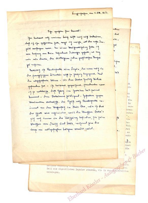 An den Lektor Fritz Arnold über den Roman „Kleider ohne Leute“ von Romain Gary (Frankfurt 1951; Übers. von Richard Moering) mit Bezug auf Voltaire, Nerval, Flaubert u. a. – Stellenw. papierbedingt gebräunt. – Beilagen.