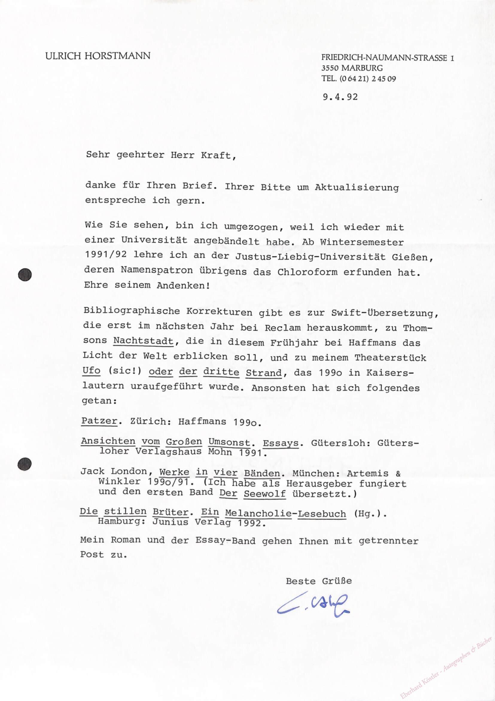 An Thomas Kraft, wegen des Eintrages in das „Lexikon der deutschsprachigen Gegenwartsliteratur“: I. (23. III. 1989): „[…] Die Bibliographie finden Sie in der Anlage. Die nennenswerten biographischen Daten sind schnell aufgelistet: Geb. 1949, sesshaft in Münster, Ausbildung einer zunehmend unerträglichen Doppelexistenz als Literat und Literaturwissenschaftler ebendort, Entlassung aus dem Hochschuldienst 1987. […]“ – II. (9. IV. 1992): „[…] Ihrer Bitte um Aktualisierung entspreche ich gern. Wie Sie sehen, bin ich umgezogen, weil ich wieder mit einer Universität angebändelt habe. Ab Wintersemester 1991/92 lehre ich an der Justus-Liebig-Universität Gießen, deren Namenspatron übrigens das Chloroform erfunden hat. Ehre seinem Andenken! Biographische Korrekturen gibt es zur Zwift-Übersetzung, die erst im nächsten Jahr bei Reclam herauskommt, zu Thomsons Nachstadt, die in diesem Frühjahr bei Haffmans das Licht der Welt erblicken soll, und zu meinem Theaterstück Ufo (sic!) oder der dritte Strand, das 1990 in Kaiserslautern uraufgeführt wurde. Ansonsten hat sich folgendes getan: Patzer […] Ansichten vom Großen Umsonst […] Jack London, Werke in vier Bänden […] Die stillen Brüter […] Mein Roman und der Essay-Band gehen Ihnen mit getrennter Post zu. “ – III.(1. II. 1993): „[…] schönen Dank für die Kopie Ihres Artikels. Es ist schon ein schönes Gefühl, als Bruder Lustig des Weltuntergangs plötzlich Gegenstand literaturgeschichtlicher Spurensicherung zu sein. […]“.