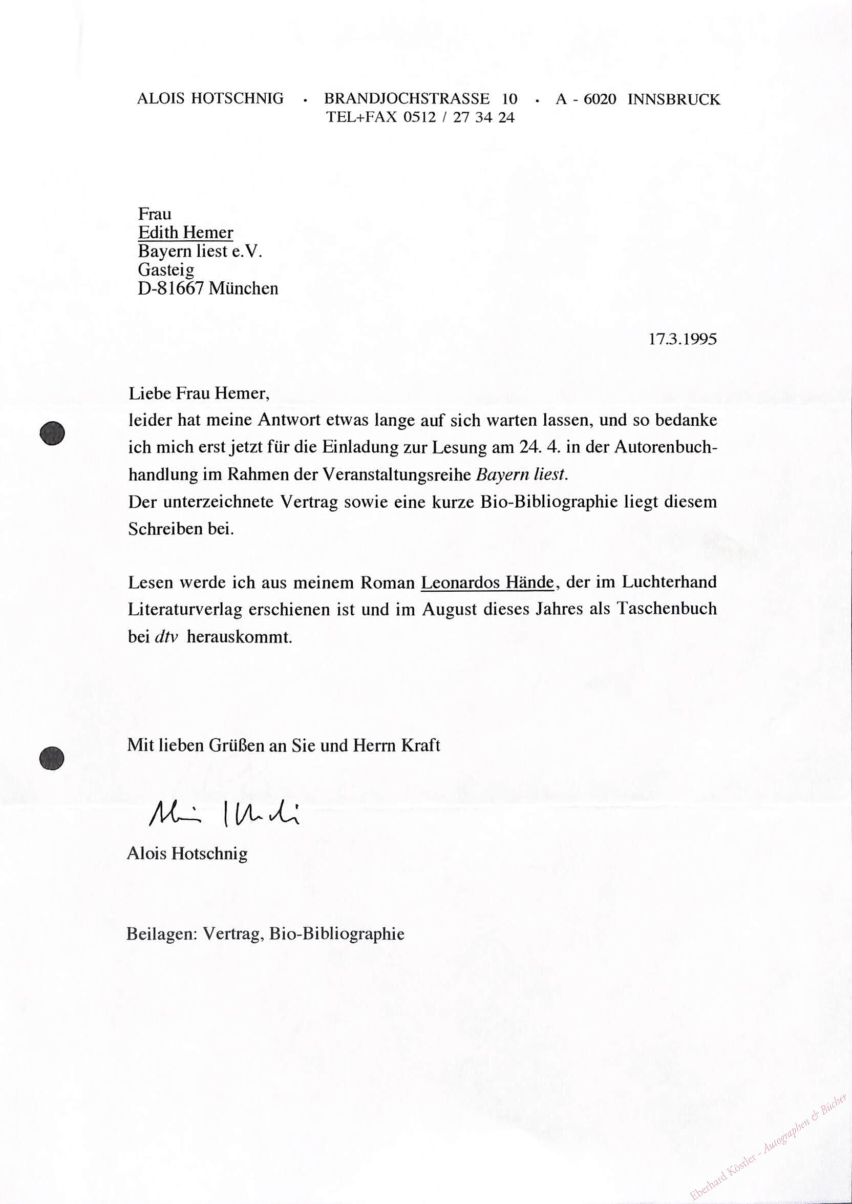 An Edith Hemer: „[…] leider hat meine Antwort etwas lange auf sich warten lassen, und so bedanke ich mich erst jetzt für die Einladung zur Lesung am 24.4. in der Autorenbuchhandlung im Rahmen der Veranstaltungsreihe Bayern liest. Der unterzeichnete Vertrag sowie eine kurze Bio-Bibliographie liegen diesem Schreiben bei. Lesen werde ich aus meinem Roman Leonhardos Händer, der im Luchterhand Lietraturverlag erschienen ist und im August dieses Jahres als Taschenbuch bei dtv heruaskommt. […]“