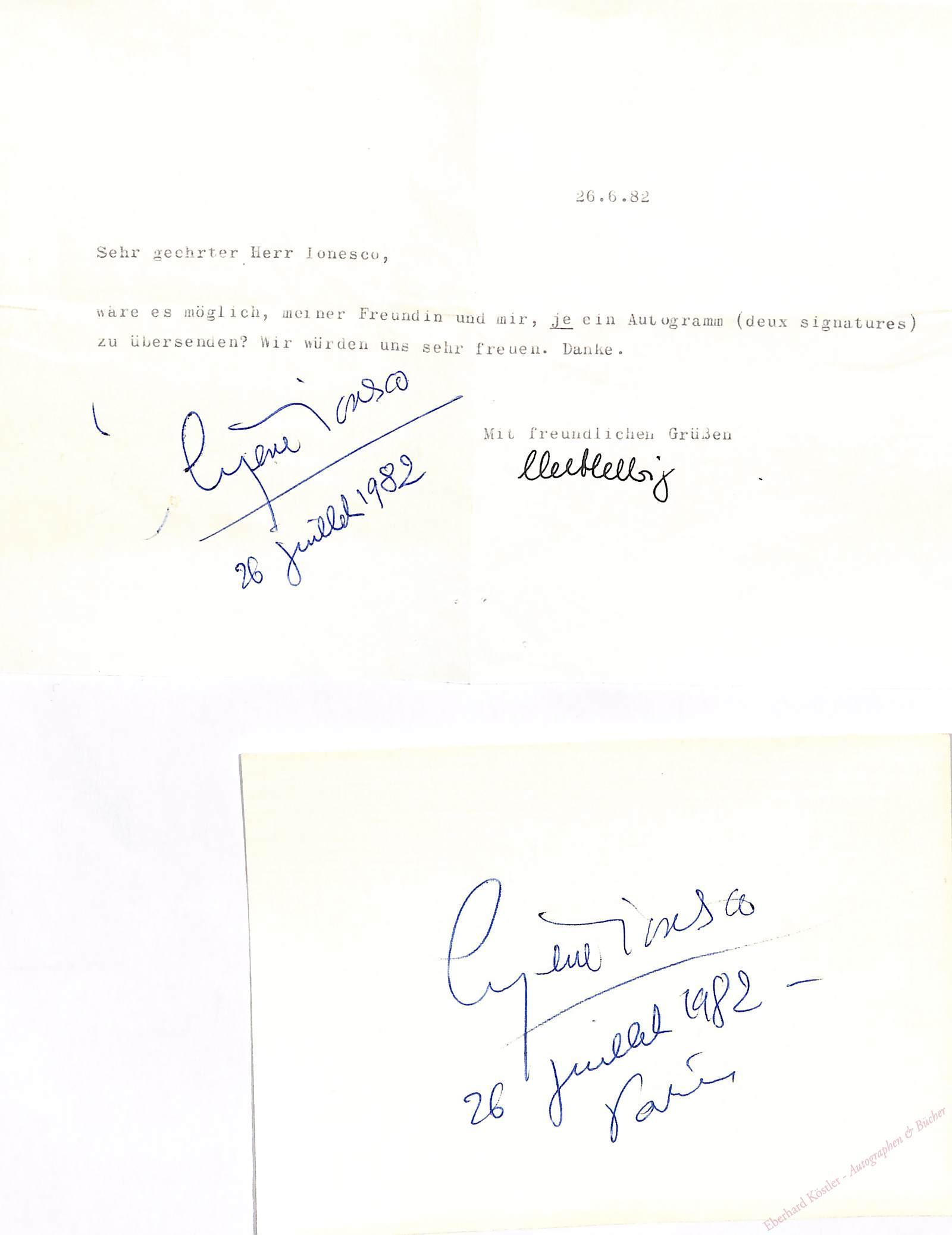 Eigenh. Namenszug als Albumblatt sowie eine weitere Signatur. Paris, 26. VII. 1982, Qu.-8°. Zus. 2 Seiten. Umschlag.