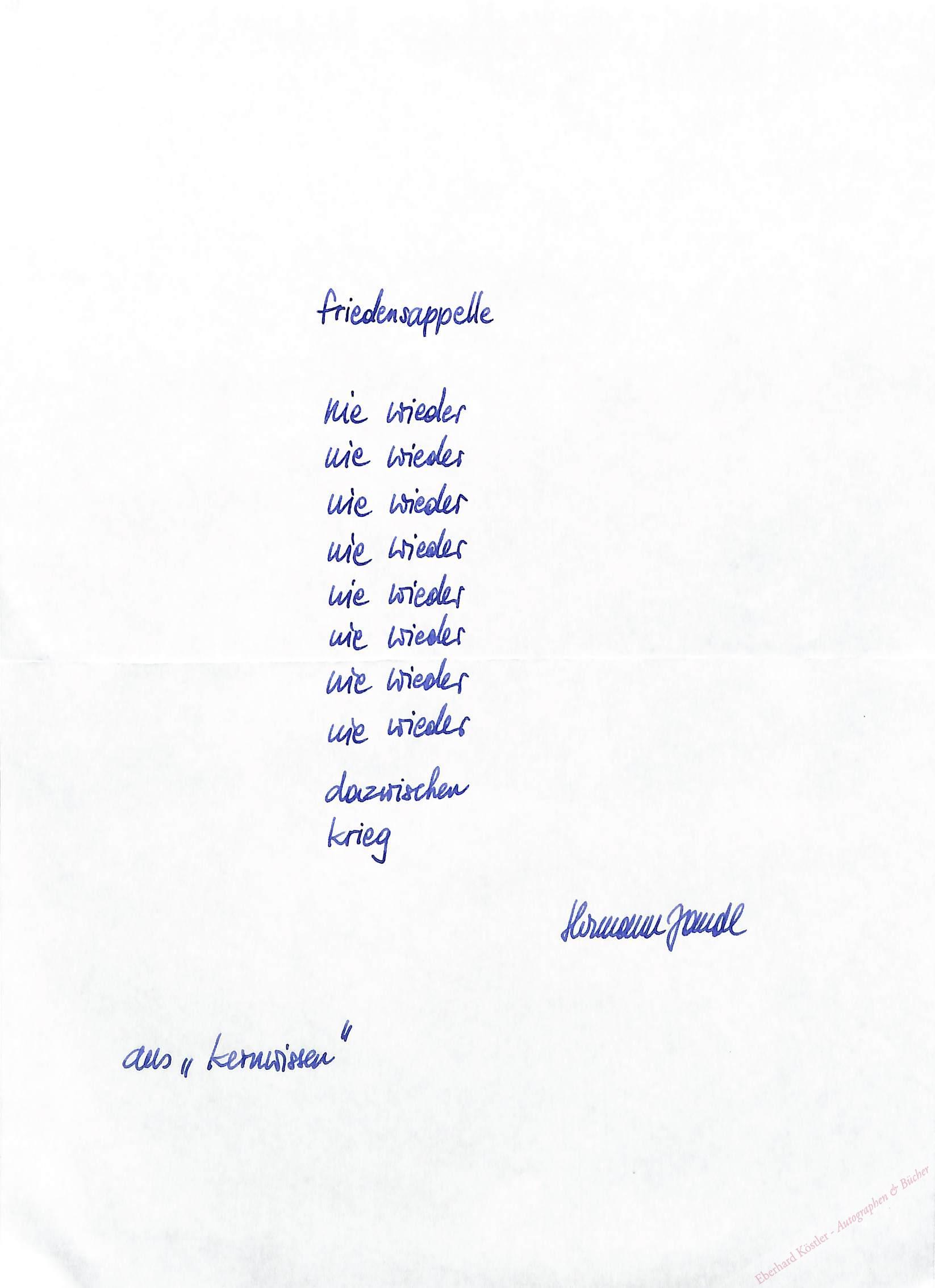 Hermann schickt einem Autographensammler das Gedicht „Friedensappelle“, aus seinem Buch „Kernwissen“ (1985). Hermann war der jüngste Bruder von Ernst Jandl. – Beiliegend ein eigenh. Umschlag sowie masch. Bio-biliographische Angaben mit eigenh. Widmung, U. und Datum.