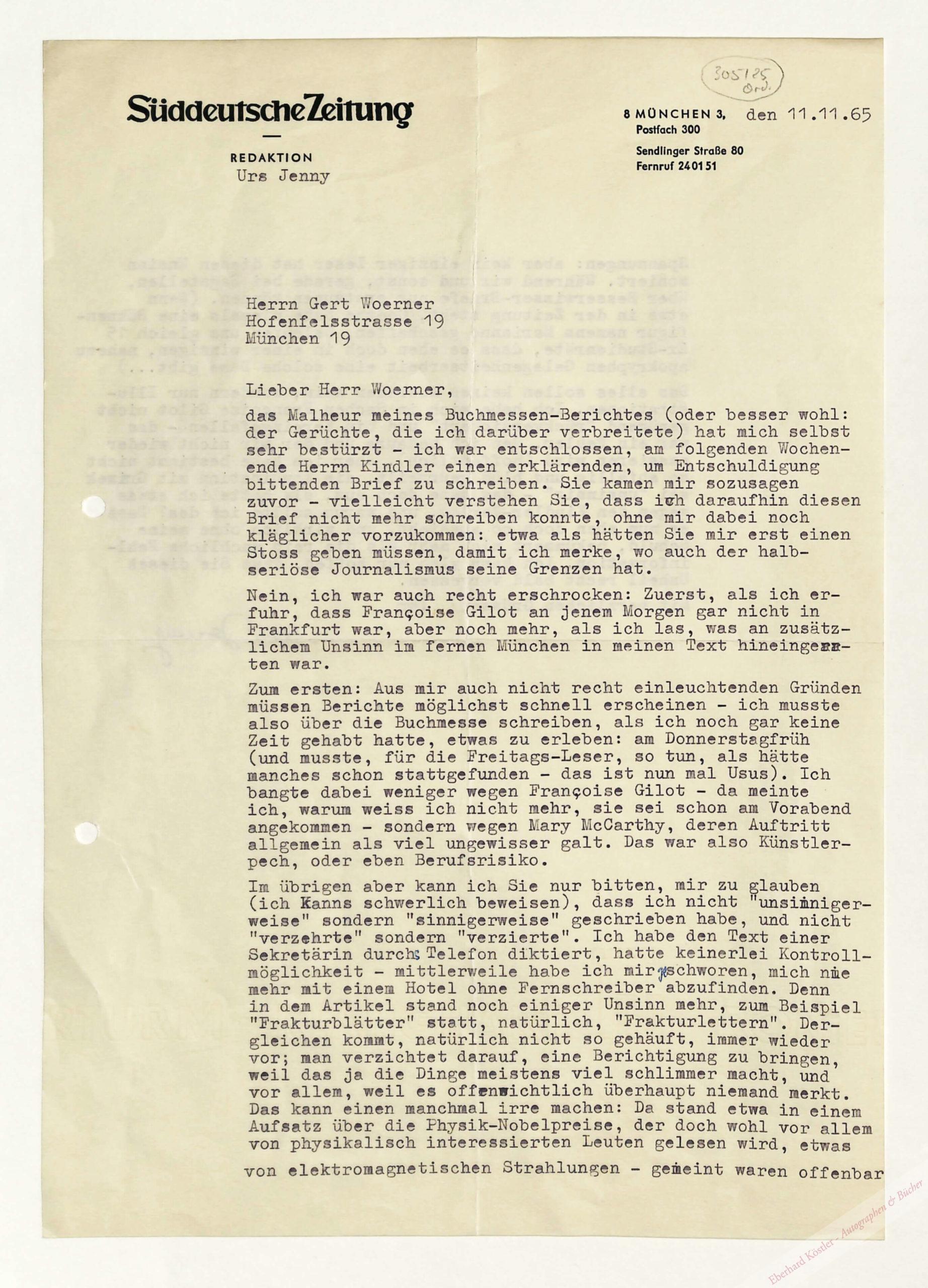 An den Verlagsleiter Gert Woerner in München: „[…] Das Malheur meines Buchmessen-Berichtes (oder besser wohl: der Gerüchte, die ich darüber verbreitete) hat mich selbst sehr bestürzt – ich war entschlossen, am folgenden Wochenende Herrn Kindler einen erklärenden, um Entschuldigung bittenden Brief zu schreiben […] Nein, ich war auch recht erschrocken: Zuerst, als ich erfuhr, dass Francoise Gilot an jenem Morgen gar nicht in Frankfurt war, aber noch mehr, als ich las, was an zusätzlichem Unsinn im fernen München in meinen Text hineingeraten war. Zum ersten: Aus mir auch nicht einleuchtenden Gründen müssen Berichte möglichst schnell erscheinen ich musste also über die Buchmesse schreiben, als ich noch gar keine Zeit gehabt hatte, etwas zu erleben: am Donnerstagfrüh (und musste, für die Freitags-Leser, so tun, als hätte manches schon stattgefunden – das ist nun mal Usus) […]“ – Jenny schrieb von 1964-69 Theater- Film- und Literaturkritiken für die Süddeutsche Zeitung.