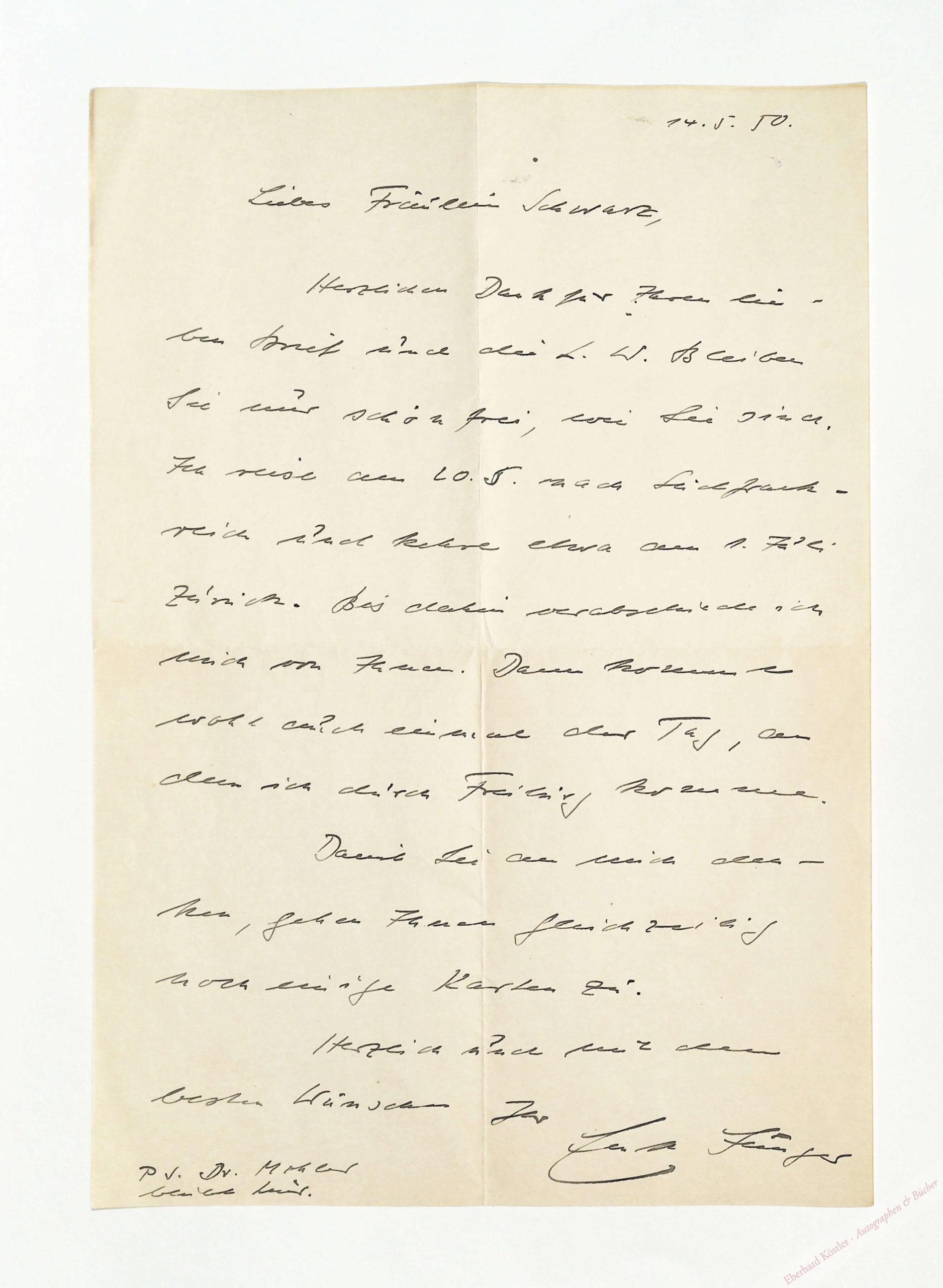 An die Buchhändlerin Mimi Schwarz in Freiburg/Br.: „Herzlichen Dank für Ihren lieben Brief und die L[etzten] W[orte]. Bleiben Sie nur schön frei, wie Sie sind. Ich reise am 20. 5. nach Südfrankreich und kehre etwa am 1. Juli zurück. Bis dahin verabschiede ich mich von Ihnen. Dann kommt wohl auch einmal der Tag, an dem ich durch Freiburg komme. Damit Sie an mich denken, gehen Ihnen gleichzeitig noch einige Karten zu […] PS. Dr. Mohler bleibt hier.“ – Jüngers Zitatensammlung „Letzte Worte“ (auf eigens gedruckten Karten) wurde 2013 ediert.