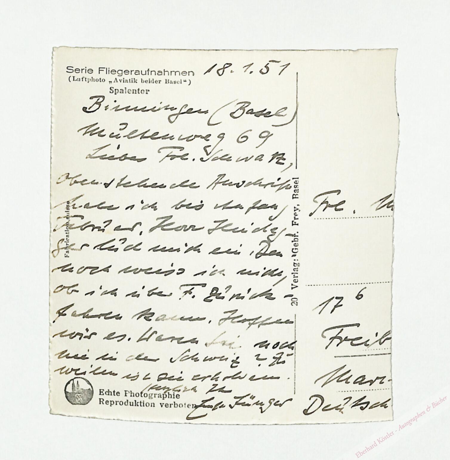 An die Buchhändlerin Mimi Schwarz in Freiburg/Br.: „Oben stehende Anschrift habe ich bis Anfang Februar. Herr Heidegger lud mich ein. Dennoch weiß ich nicht, ob ich über F[reiburg] zurückfahren kann. Hoffen wir es. Waren sie noch nie in der Schweiz? Zuweilen ist sie erholsam […]“ – Bildseite: „Spalentor“ in Basel.