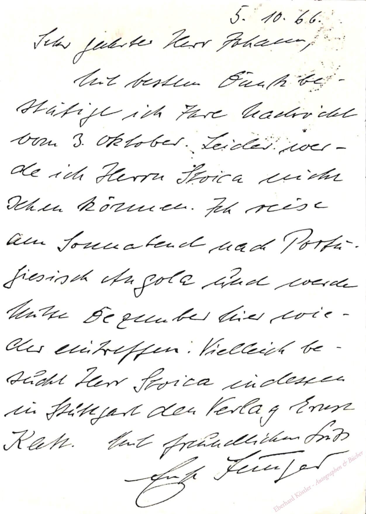 Eigenh. Postkarte mit Unterschrift Wilflingen, 5. X. 1966, 2 Seiten. Mit Adresse und gedrucktem Absender.