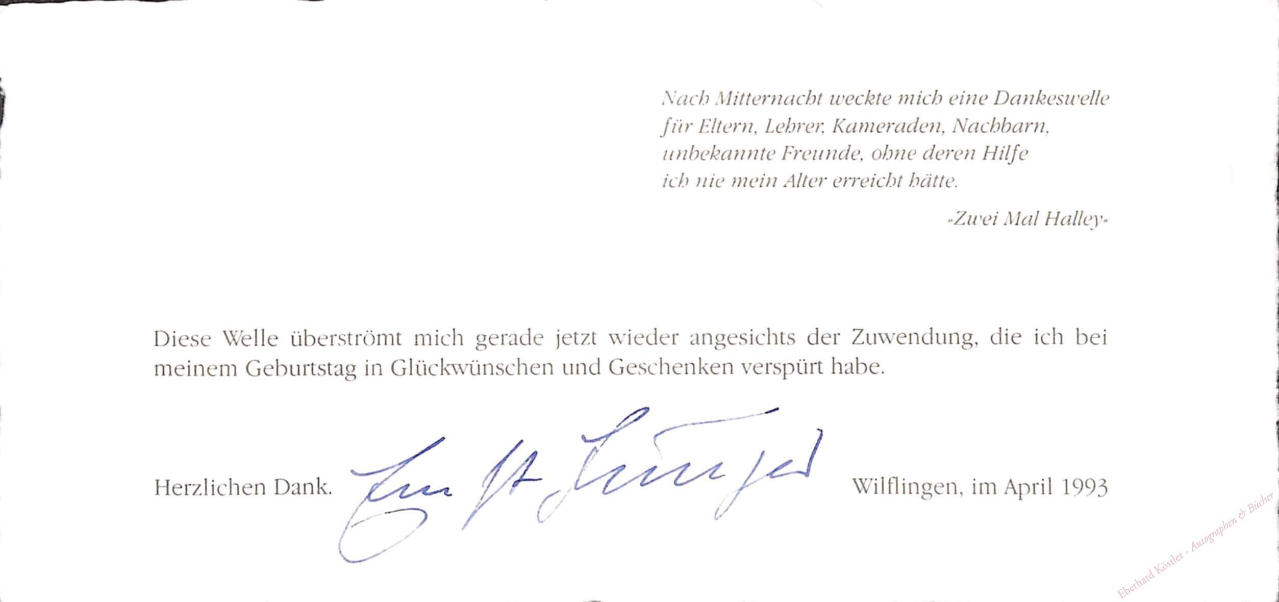 Danksagungskarte aus Anlass seines 98. Geburtstags: „Nach Mitternacht weckte mich eine Dankeswelle für Eltern, Lehrer, Kameraden, Nachbarn, unbekannte Freunde, ohne deren Hilfe ich nie mein Alter erreicht hätte. | ‚Zwei Mal Halley‘ | Diese Welle überströmt mich gerade jetzt wieder angesichts der Zuwendung, die ich bei meinem Geburtstag in Glückwünschen und Geschenken verspürt habe. | Herzlichen Dank.“