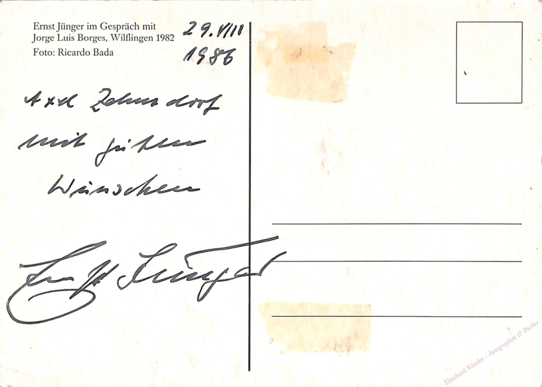 „Axel Zehnsdorf mit guten Wünschen Ernst Jünger“, vielleicht für den gleichnamigen rechten Politiker. – Bildseite: Jünger im Gespräch mit Borges, 1982.