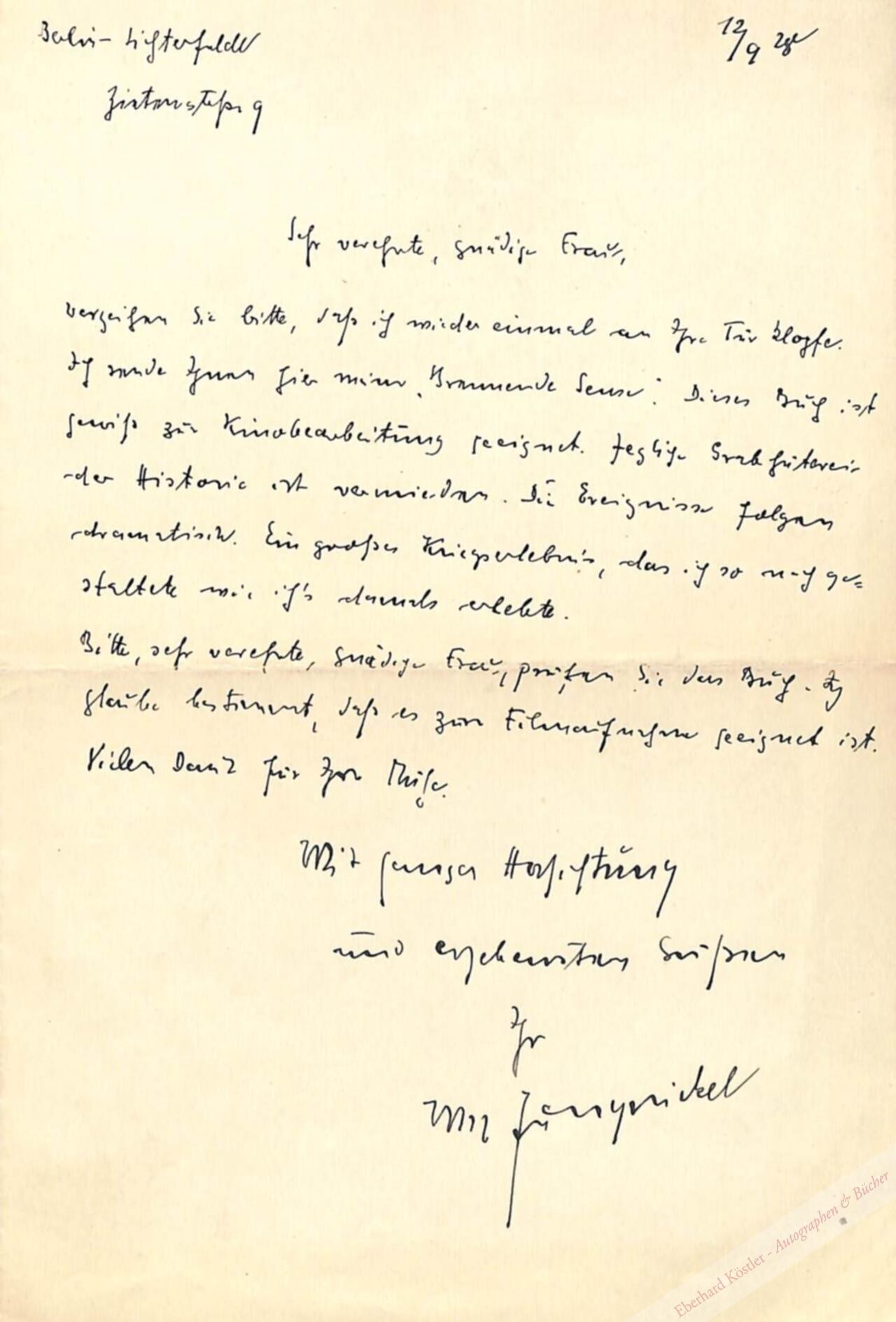 Jungnickel sendet sein Buch „Brennende Sense“ (Bad Pyrmont 1928) in der Hoffnung, dass dieses eine Verfilmung erfährt: „Sehr verehrte, gnädige Frau, verzeihen Sie bitte, daß ich wieder einmal an Ihre Tür klopfe. Ich sende Ihnen hier meine ‚Brennende Sense‘. Dieses Buch ist Gewiss zur Kinobearbeitung geeignet. Jegliche Grabhüterei der Historie ist vermieden. Die Ereignisse folgen dramatisch. Ein großes Kriegserlebnis, das ich so nach gestaltete wie ich’s damals erlebte. Bitte, sehr verehrte, gnädige Frau, prüfen Sie das Buch. Ich glaube bestimmt, daß es zur Filmaufnahme geeignet ist. Vielen Dank für Ihre Mühe.“
