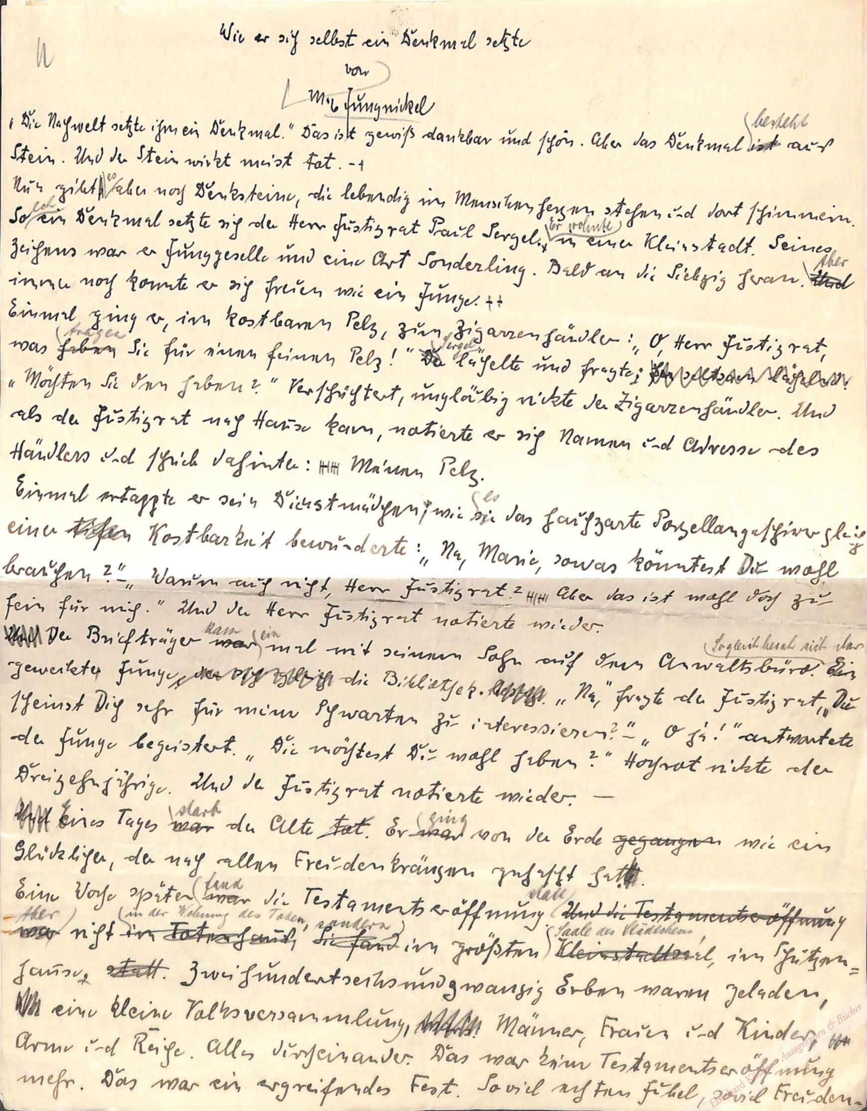 „Wie er sich selbst ein Denkmal setzte“. – Der Text dieser Schnurre um einen Justizrat erschien am 23. Juni 1927 in „Neue Mannheimer Zeitung“. – Mit Korrekturen in Bleistift.