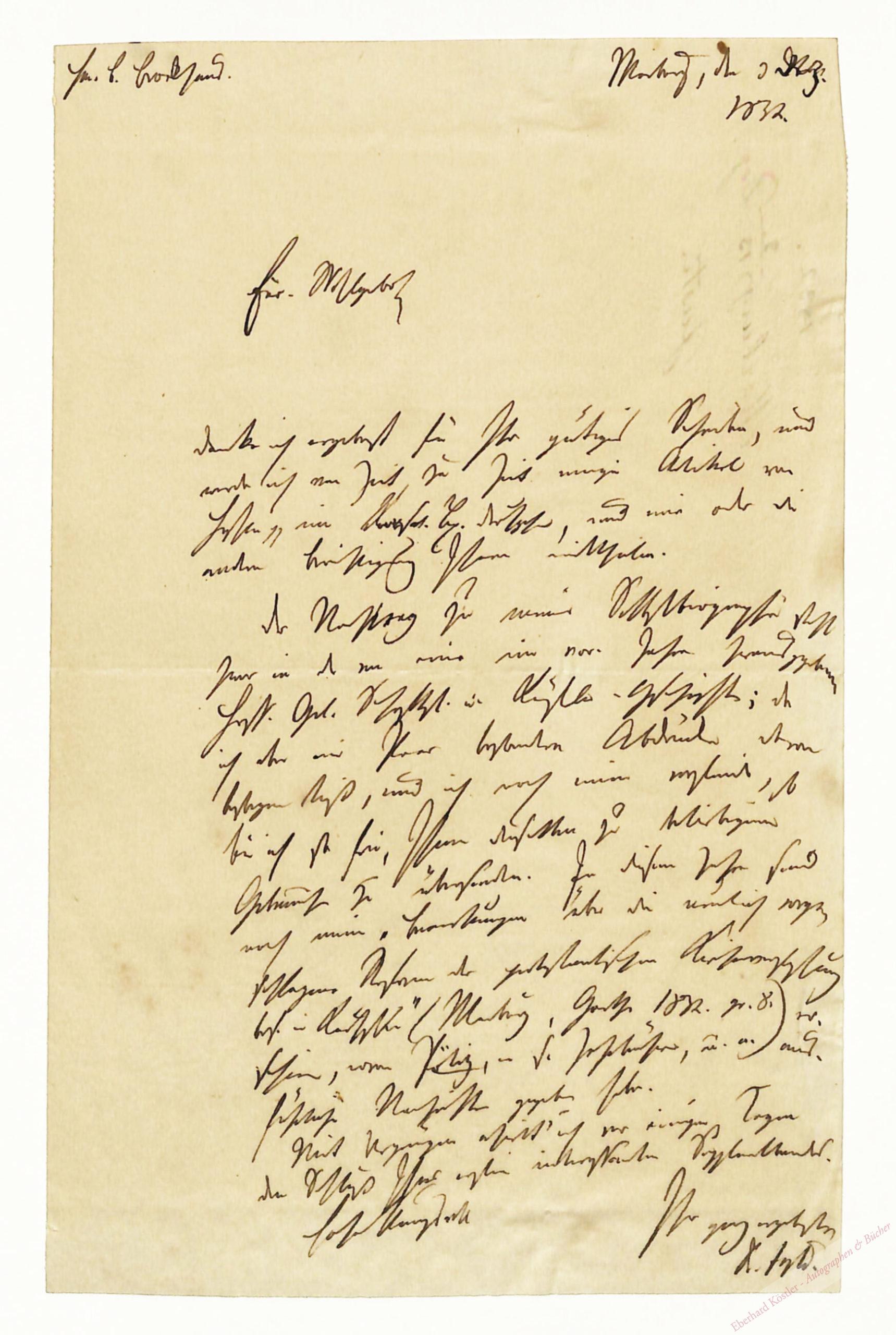An den Verlag Brockhaus in Leipzig mit dem Versprechen, die Artikel über Hessen im Konversationslexikon durchzusehen und zu berichtigen. Weist auf den Nachtrag zu seiner Selbstbiographie hin, von der er einen Sonderdruck übersendet und nennt seine neuesten Schriften. – Justi gehörte dem sogenannten Marburger Romantikerkreis an, zusammen mit Bettina und Clemens Brentano, Karoline von Günderode, Sophie Mereau, Achim von Arnim, Leonhard und Friedrich Creuzer, Jacob und Wilhelm Grimm sowie Friedrich Carl von Savigny.