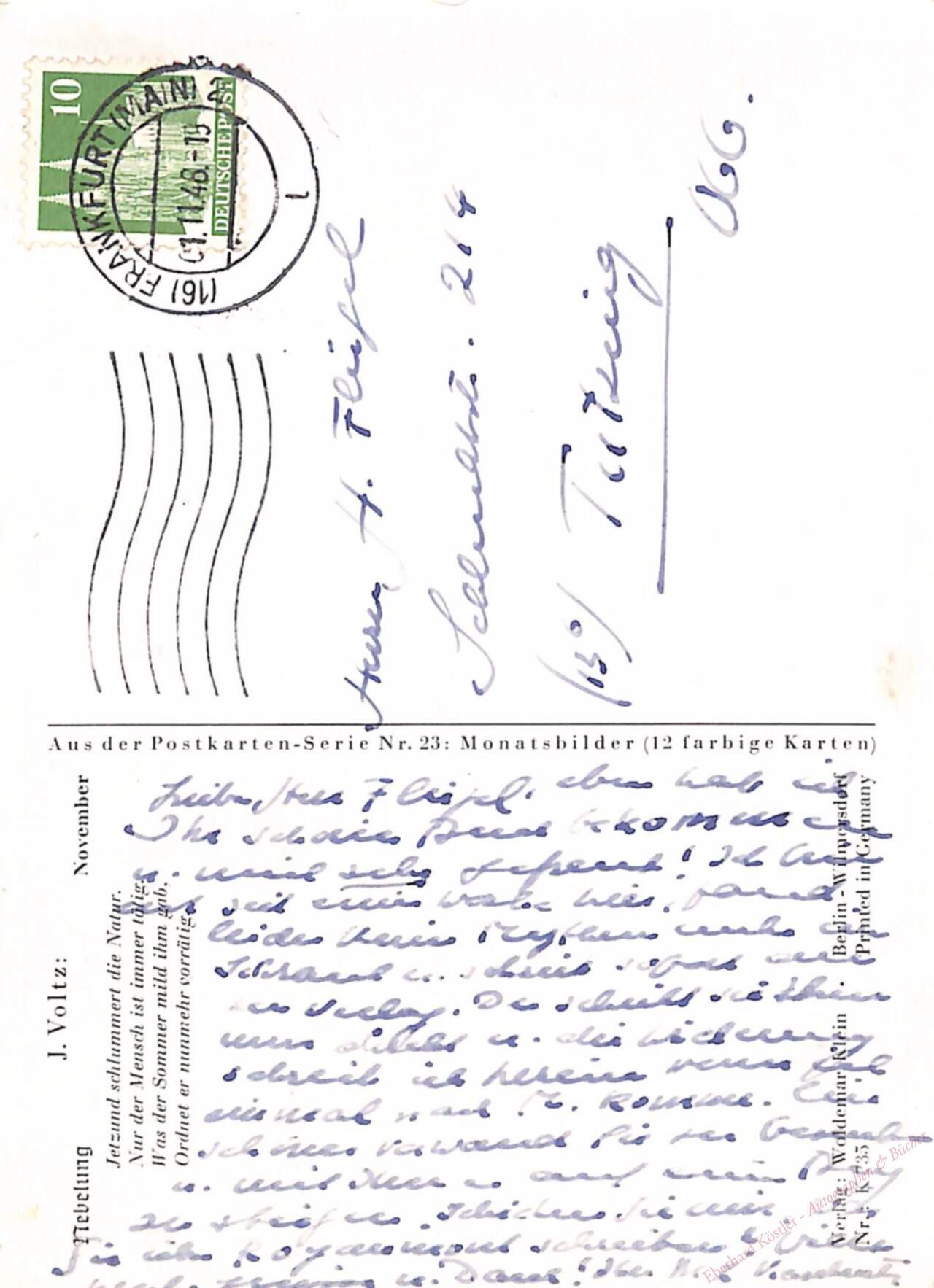An Heinz Flügel in Tutzing: „[…] eben hab ich Ihr schönes Buch bekommen und mich sehr gefreut! Ich bin erst seit einer Woche hier, fand leider kein Mythen mehr im Schrank und schreib sofort an den Verlag. Der schickt sie Ihnen nun rüber und die Widmung schreib ich herein wenn Sie einmal nach F. kommen. […]“ – Gemeint ist „Griechische Mythen“. – Die erste Begegnung zwischen Marie Luise Kaschnitz und der Evangelischen Akademie Tutzing fand 1951 im Rahmen der Tagung „Wozu Dichtung?“ statt. Dort trug die Schriftstellerin am 9. September einen Gedichtzyklus vor, der unter dem Titel „Tutzinger Gedichtkreis“ ihren 1957 erscheinenden Lyrikband „Neue Gedichte“ eröffnet. Es ist der letzte große Gedichtzyklus von Marie Luise Kaschnitz, in dem sie nach den Erfahrungen von Holocaust und Krieg ein anklagendes Gespräch mit Gott führt.