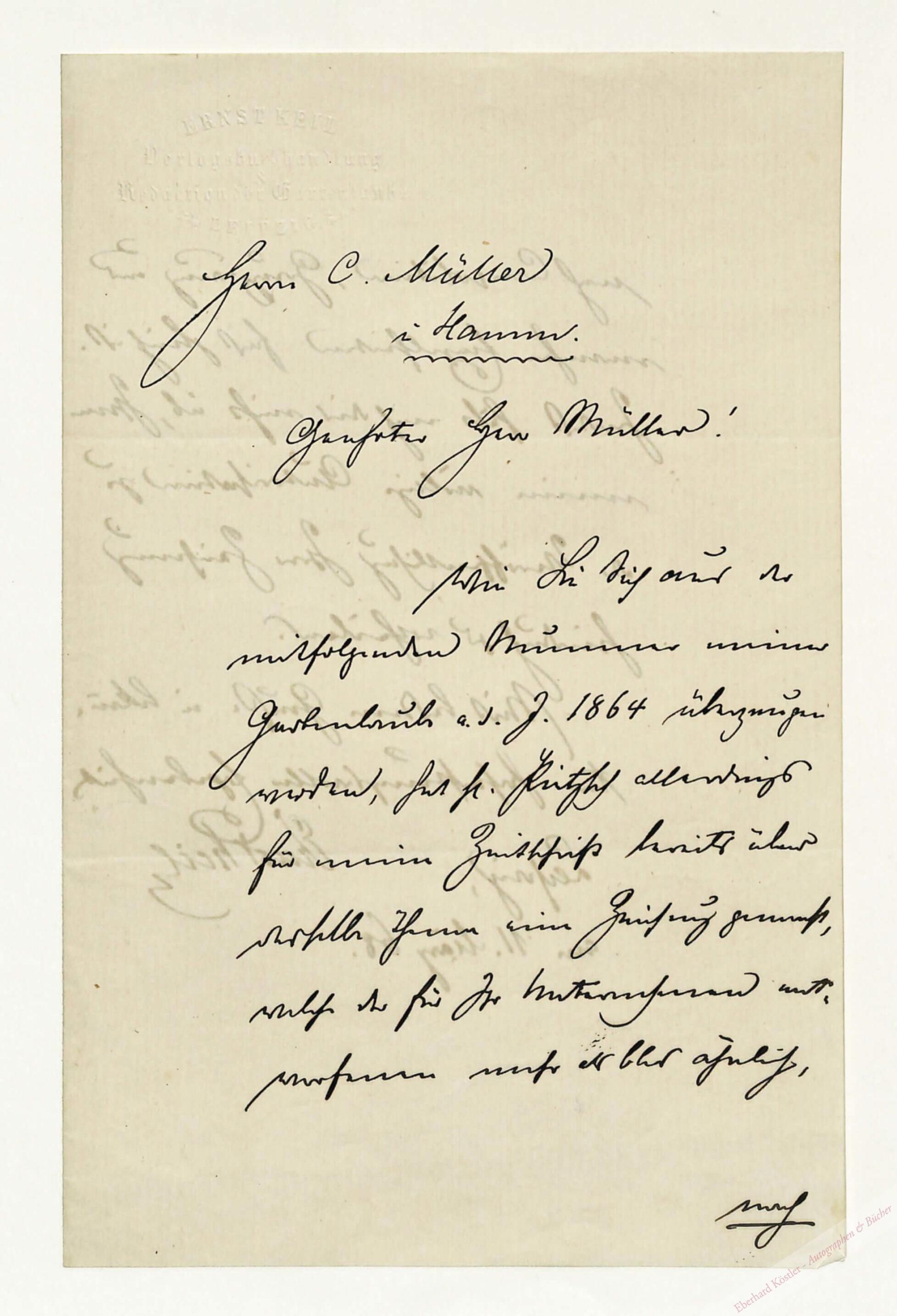An C. Müller in Hamm, dem er die „nötige Autorisation zu der Veröffentlichung Ihrer Zeichnung“ erteilt, eine ähnliche Zeichnung sei aber bereits 1864 in der „Gartenlaube“ erschienen.