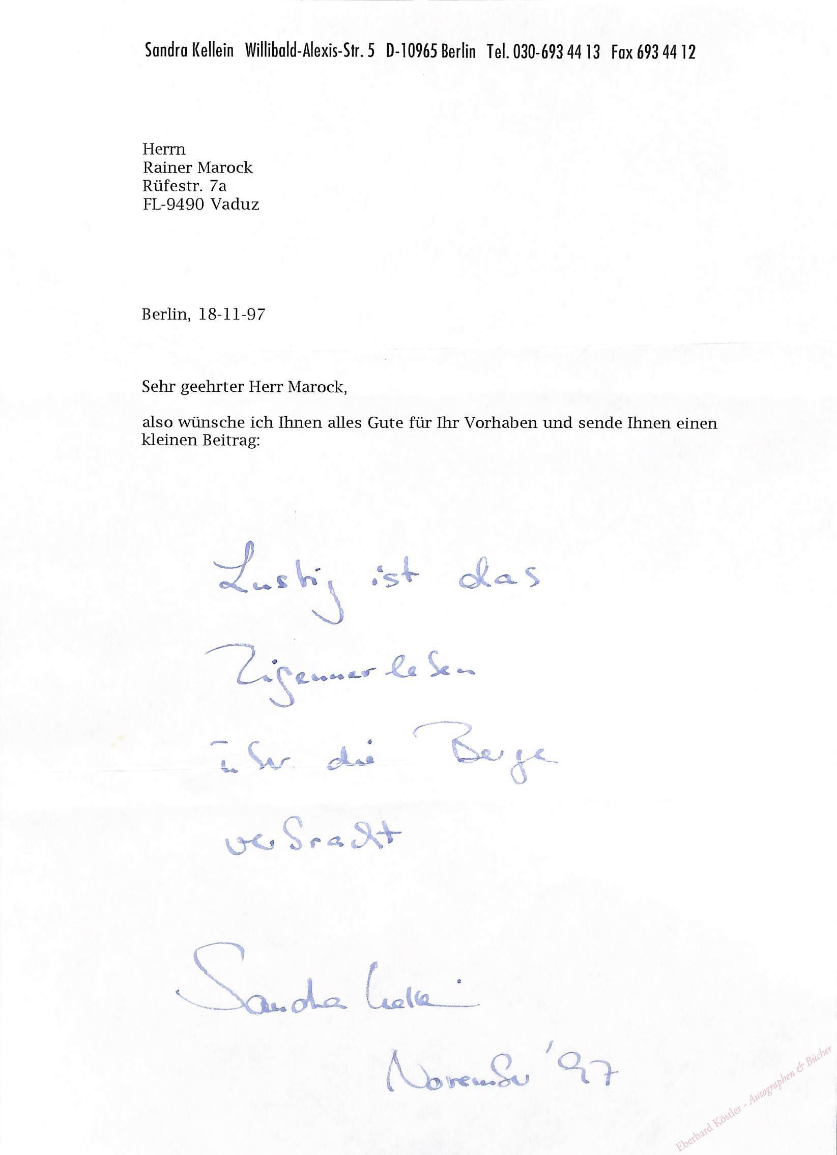 Kellein antwortet einem Autographensammler. Eigenhändig ist ein kleines Gedicht hinzugefügt: „Lustig ist das | Zigeunerleben | über die Berge | verbracht“