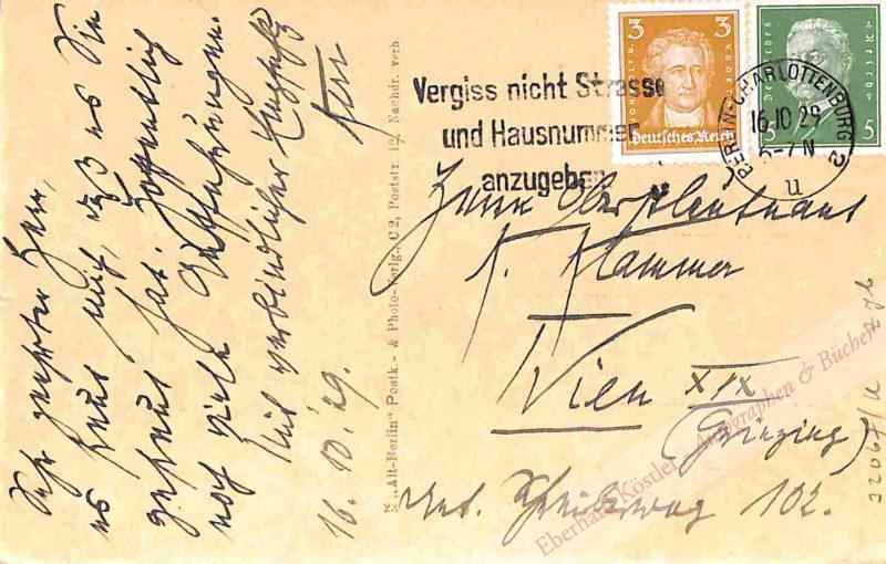 An den Schriftsteller Karl Klammer in Wien: „[…] Es freut mich, daß es Sie gefreut hat. Hoffentlich noch viele Aufführungen […]“ – Ansicht des Bauhofs am Berliner Kupfergraben.