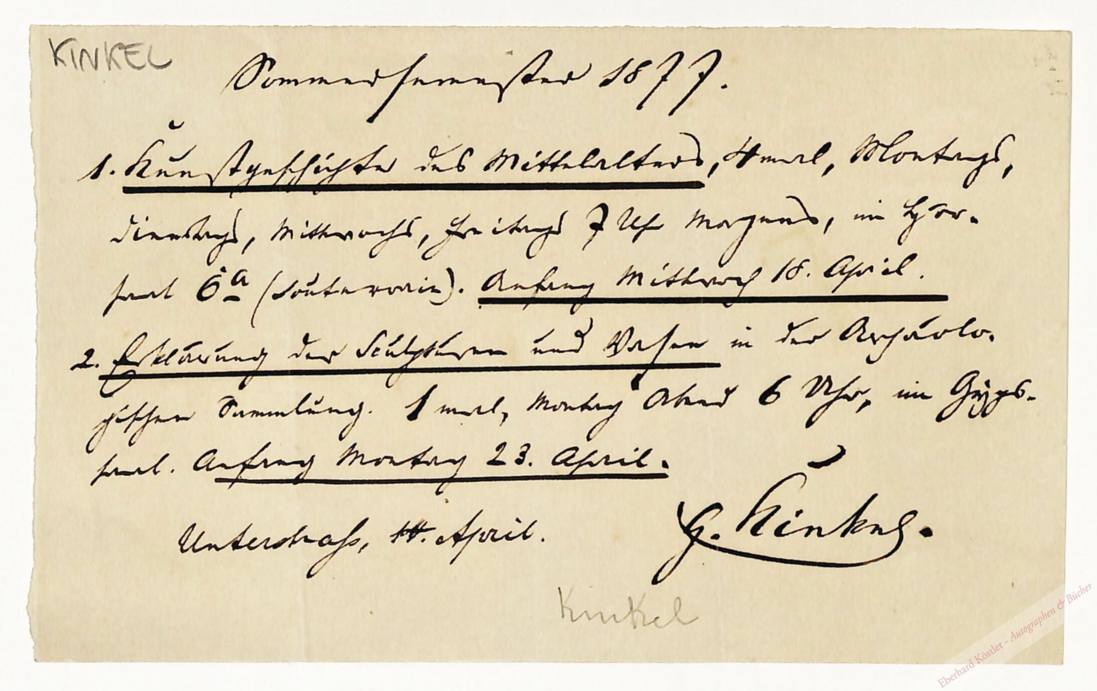 Vorlesungsankündigung für das Sommersemester 1877: „Kunstgeschichte des Mittelalters“ und „Erklärung der Sculpturen und Vasen in der Archäologischen Sammlung“. – 1866 hatte Kinkel eine Professur für Kunstgeschichte am Polytechnikum in Zürich angenommen.