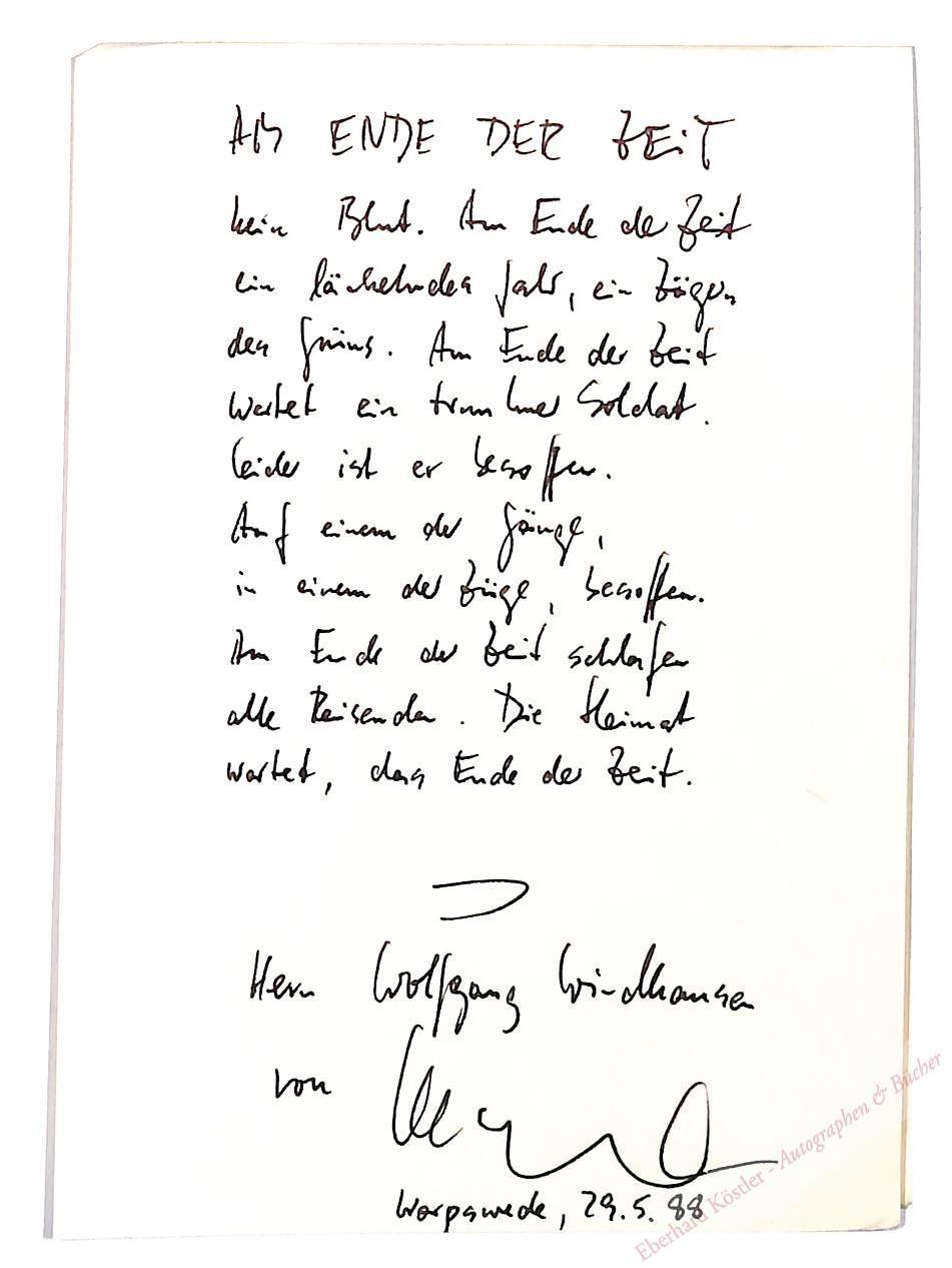 „Am Ende der Zeit kein Blut. Am Ende der Zeit ein lächelndes Jahr, ein zögernder Grund. Am Ende der Zeit wartet ein trunkner Soldat. Leider ist er besoffen. Auf einem der Gänge, in einem der Züge, besoffen. Am Ende der Zeit schlafen alle Reisenden. Die Heimat wartet, das Ende der Zeit …“