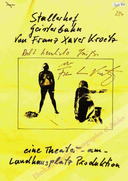 „Recht herzliche Grüße Ihr Franz Xaver Kroetz“. – Auf dem Programm zur Inszenierung „Stallerhof. Geisterbahn“ im Theater am Landhausplatz, Innsbruck, Premiere am 13. April 1977 (12 Blatt, mit Illustrationen, geheftet).