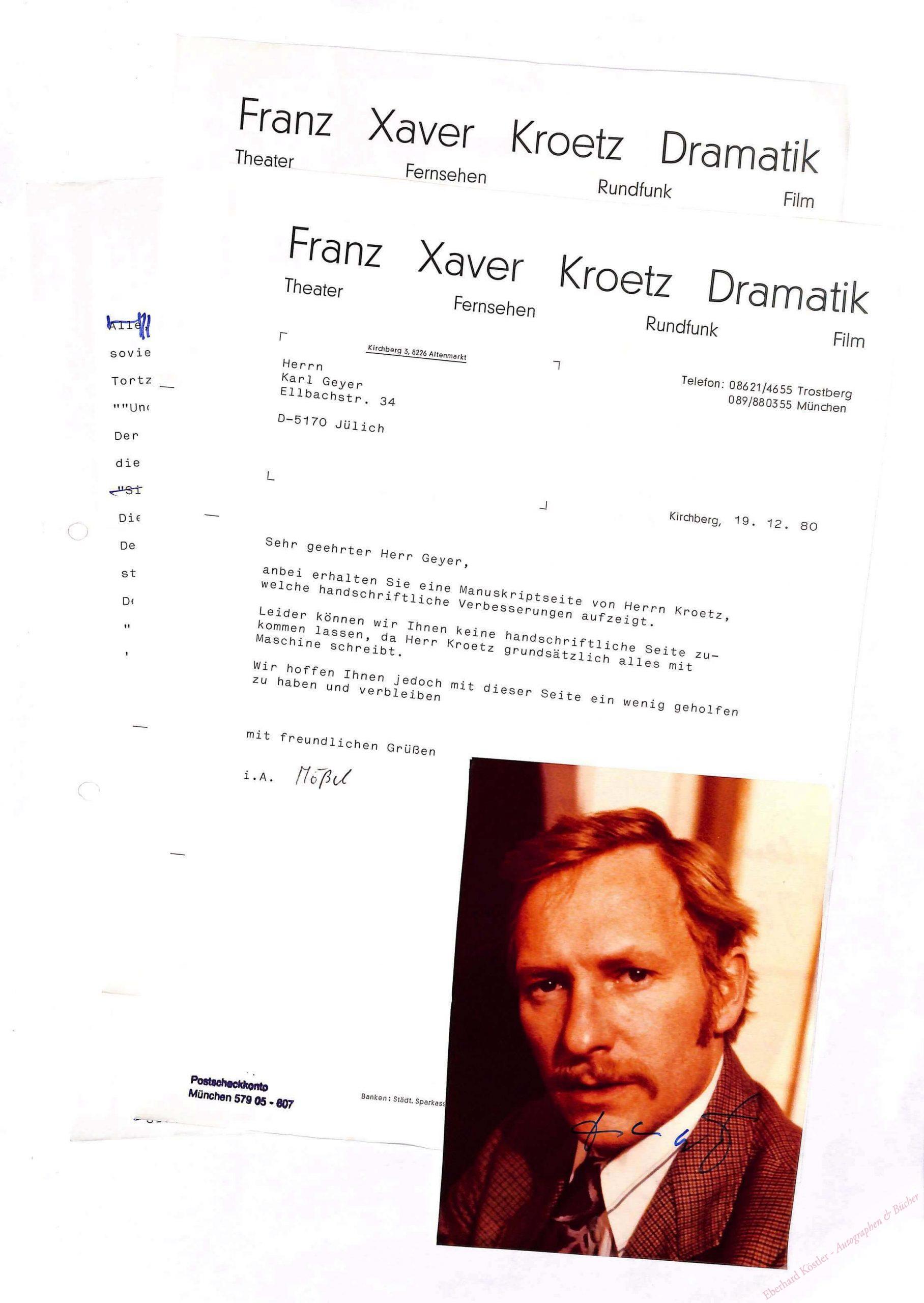 Aus einer (möglicherweise unveröffentlichten) Erzählung. Im Begleitbrief weist Kroetz darauf hin, dass er alles mit der Maschine und nicht mit der Hand schreibe, weshalb es keine Manuskriptseiten gebe.