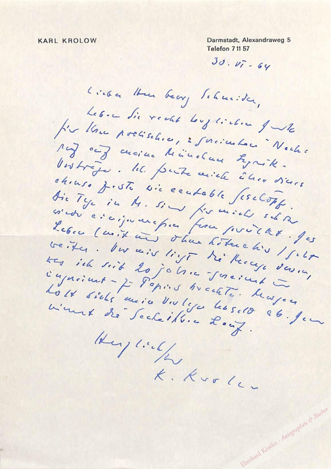 An den Schriftsteller Georg Schneider (1902-1972) in München: „[…] haben Sie recht herzlichen Dank für Ihren poetischen, ‚gereimten‘ Nachruf auf meine Münchner Lyrik-Vorträge. Ich freute mich über dieses ebenso feste wie cantable Geschöpf. Die Tage in M. sind für mich schon wieder einigermaßen fern gerückt. Das Leben (mit und ohne Literatur) geht weiter. Vor mir liegt die Menge davon, was ich seit 20 Jahren – gereimt und ungereimt – zu Papier brachte. Morgen holt sich’s mein Verleger Unseld ab. Dann nimmt die Sache ihren Lauf […]“ – Krolows „Gesammelte Gedichte“ erschienen dann 1965 bei Suhrkamp in Frankfurt.