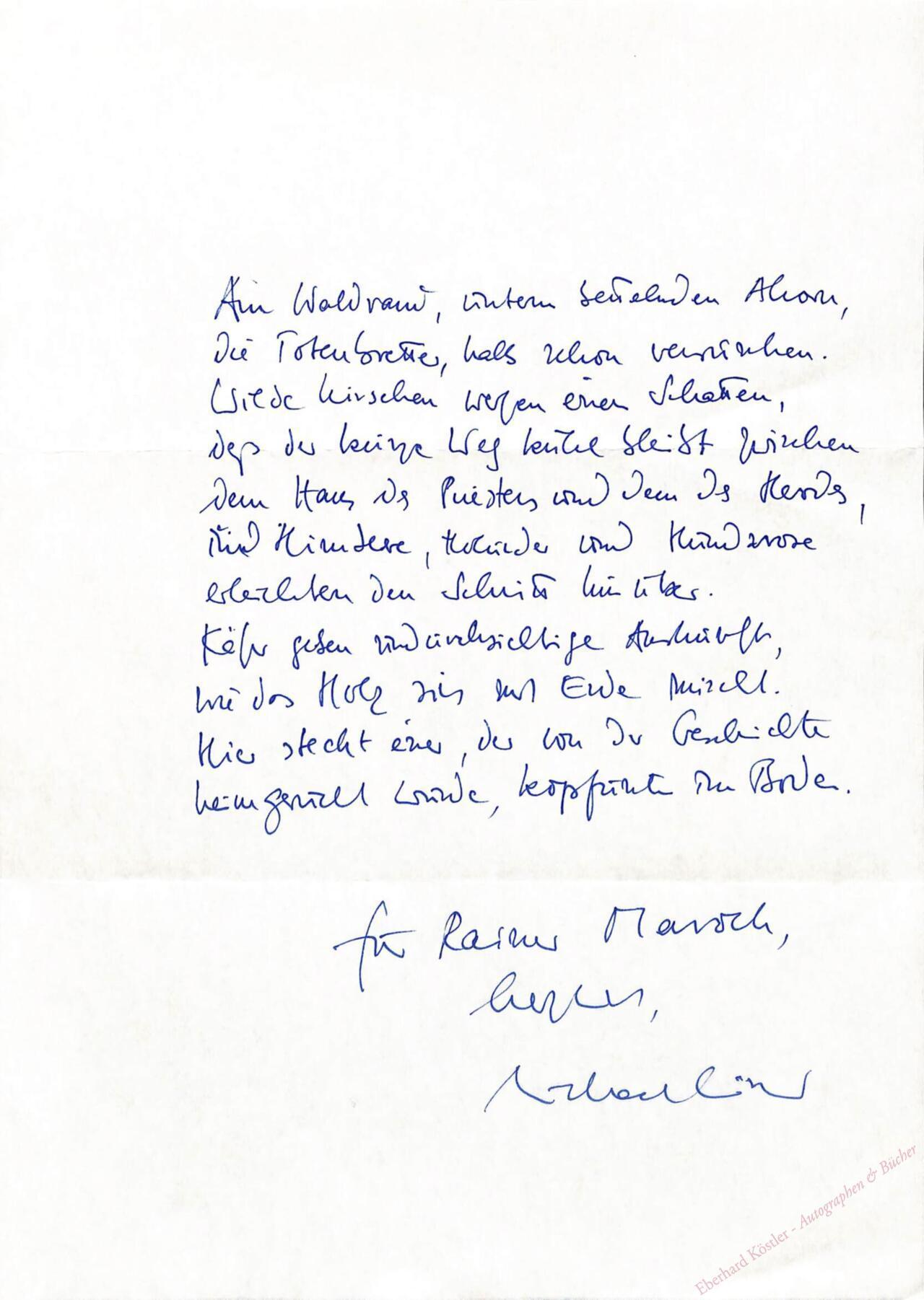 Eigenhändiges Gedichtmanuskript (11 Zeilen) mit Widmung und Unterschrift München, ohne Datum, 4°. 1 Seite.