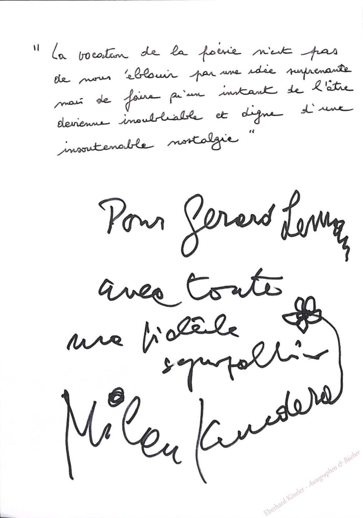 Unter einem Zitat von Sammlerhand: „Pour Gérard […] avec toute ma fidèle sympathie [kleine Blume] Milan Kundera“.