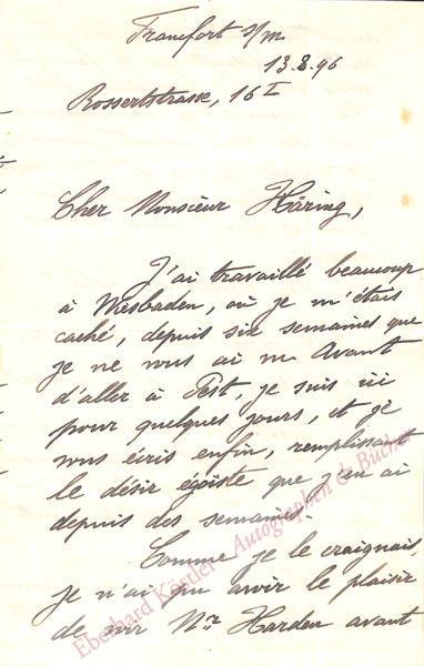 An den Verleger von Maximilian Hardens Zeitschrift „Die Zukunft“, Häring. Lacaze bedauert, Harden nicht getroffen zu haben und bietet drei Aufsätze an: „Le faire de Zola“, „Le Duel et l’honneur“ und „Jules Simon et l’Avenir“. Als Pazifist war Lacaze ein Gegner des Duells. Er schieb auch über Zola: „A Lourdes Avec Zola“ (1894). – Unterstreichungen des Empfängers.